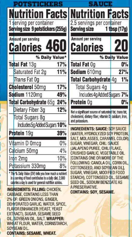 Ingredients: Chicken, Cabbage, Green Onions, Ginger, Dehydrated Garlic, Water, Spice, Flavor Enhancer (Yeast, Yeast Extract), Sugar, Sesame Seed Oil, Soybean Oil, Wheat Flour, Cornstarch, Soy Sauce Water, Hydrolyzed Soy Protein, Salt, Molasses, Caramel Color), Vinegar, Canola Oil, Corn Oil, Cottonseed, And Soybean Oil], Sugar, Vinegar, Modified Food Starch, Cottonseed Oil, Sesame, Wheat, Soy Contains: Sesame Seeds and their derivates, Soybean and its Derivatives, Wheat and Their Derivatives
