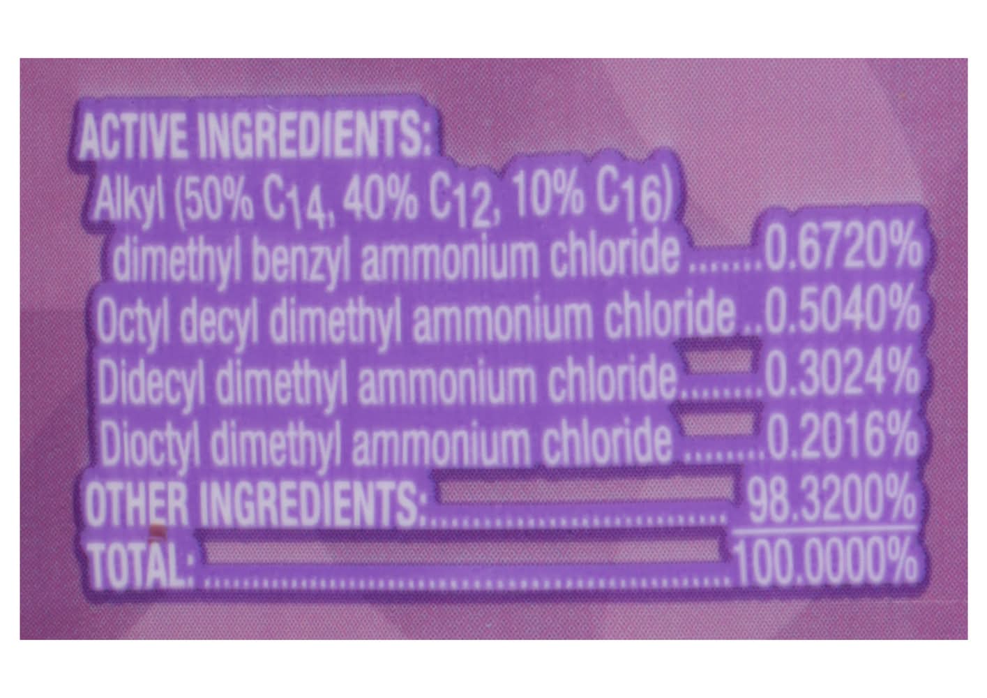 Ingredients: Active Ingredients: Alkyl (50% C14, 40% C12, 10% C16), Dimethyl Benzyl Ammonium Chloride - 0.6720%, Octyl Decyl Dimethyl Ammonium Chloride - 0.5040%, Didecyl Dimethyl Ammonium Chloride - 0.3024%, Dioctyl Dimethyl Ammonium Chloride - 0.2016%. Other Ingredients: 98, 3200%. Total: 100, 0000%
