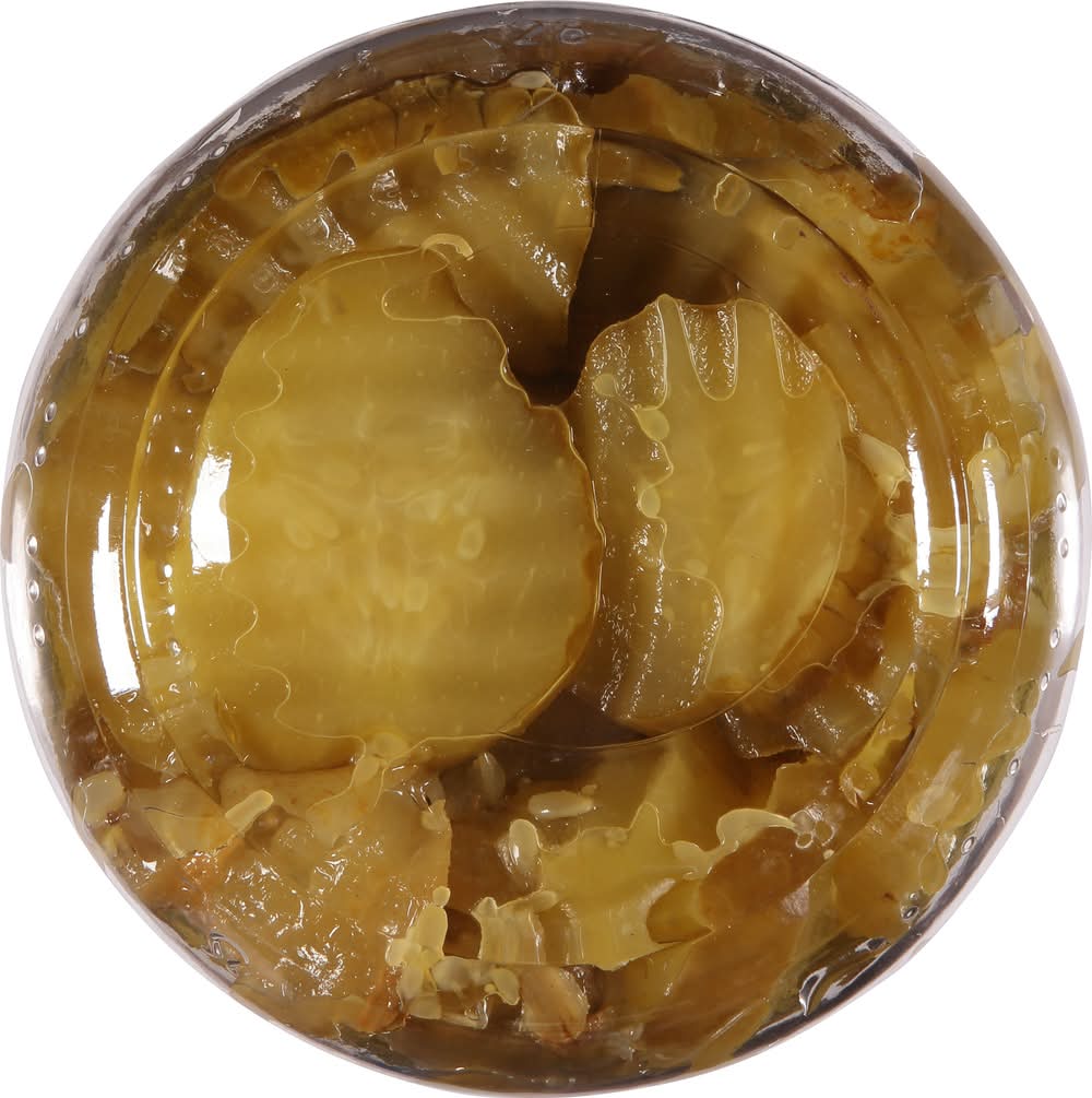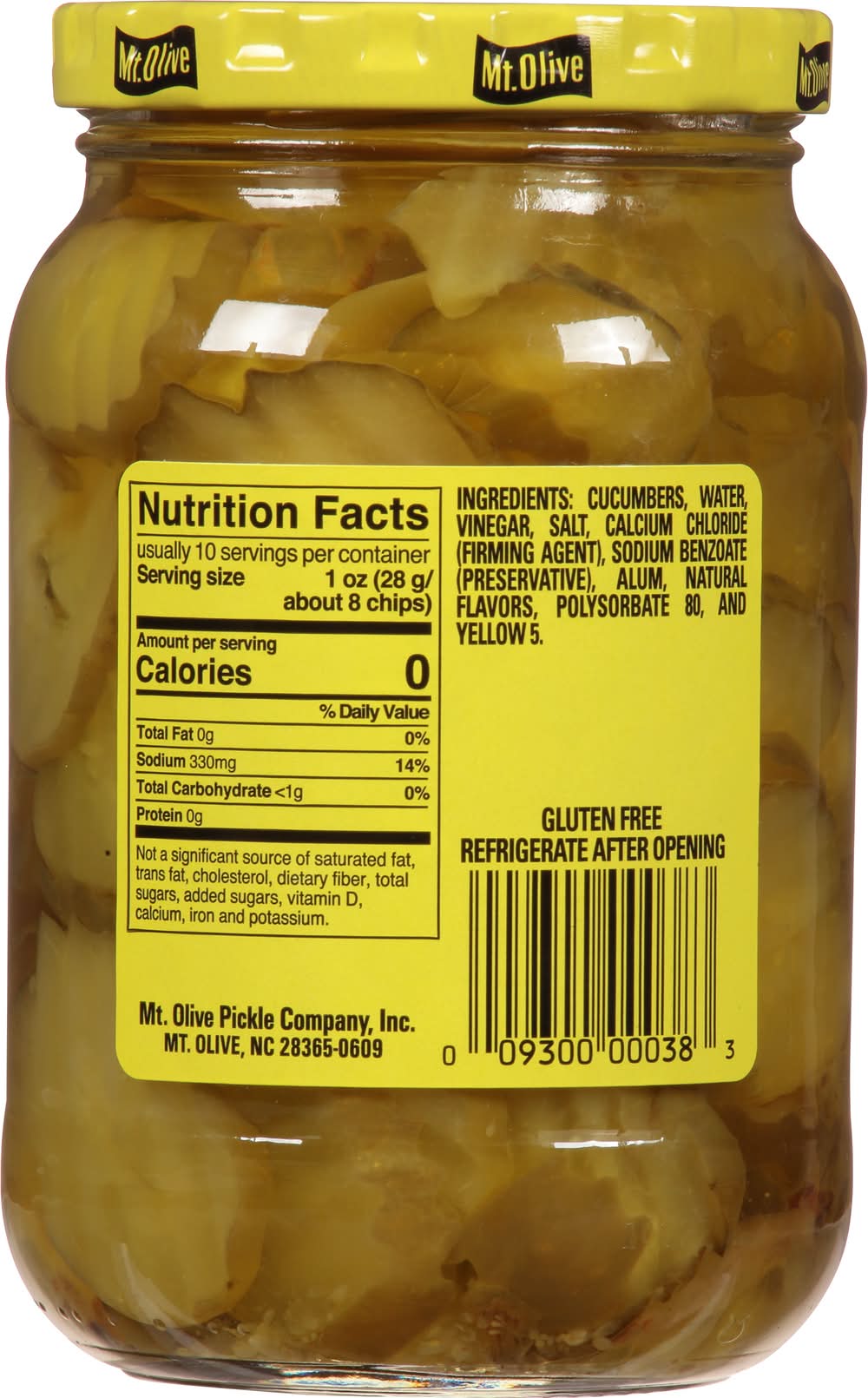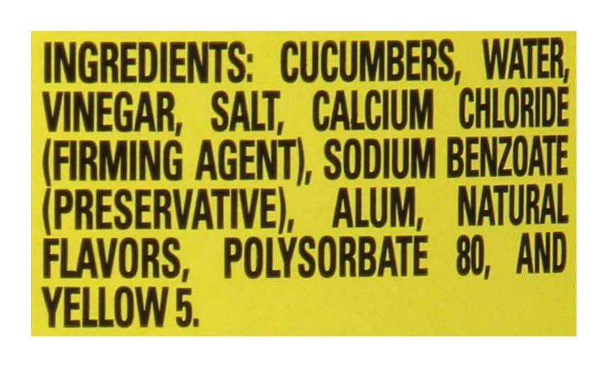 Ingredients: Cucumber, Water, Vinegar, Salt, Calcium Chloride (Firming Agent), Sodium Benzoate (Preservative), Alum, Natural Flavors, Polysorbate 80, and Yellow 5