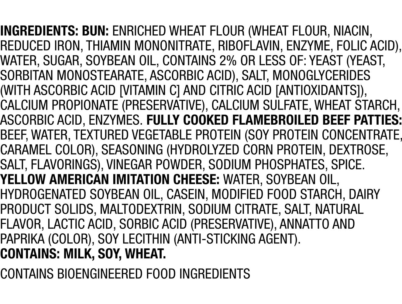 Ingredients: BUN: Enriched wheat flour (wheat flour, niacin, reduced iron, thiamin mononitrate, riboflavin, enzyme, folic acid), water, sugar, soybean oil, contains 2% or less of: yeast (yeast, sorbitan monostearate, ascorbic acid), salt, monoglycerides (with ascorbic acid [vitamin c] and citric acid [antioxidants]), calcium propionate (preservative), calcium sulfate, wheat starch, ascorbic acid, enzymes. FULLY COOKED FLAMEBROILED BEEF PATTIES: Beef, water, textured vegetable protein (soy protein concentrate, caramel color), seasoning (hydrolyzed corn protein, dextrose, salt, flavorings), vinegar powder, sodium phosphates, spice. YELLOW AMERICAN IMITATION CHEESE: Water, soybean oil, hydrogenated soybean oil, casein, modified food starch, dairy product solids, maltodextrin, sodium citrate, salt, natural flavor, lactic acid, sorbic acid (preservative), annatto and paprika (color), soy lecithin (anti-sticking agent).