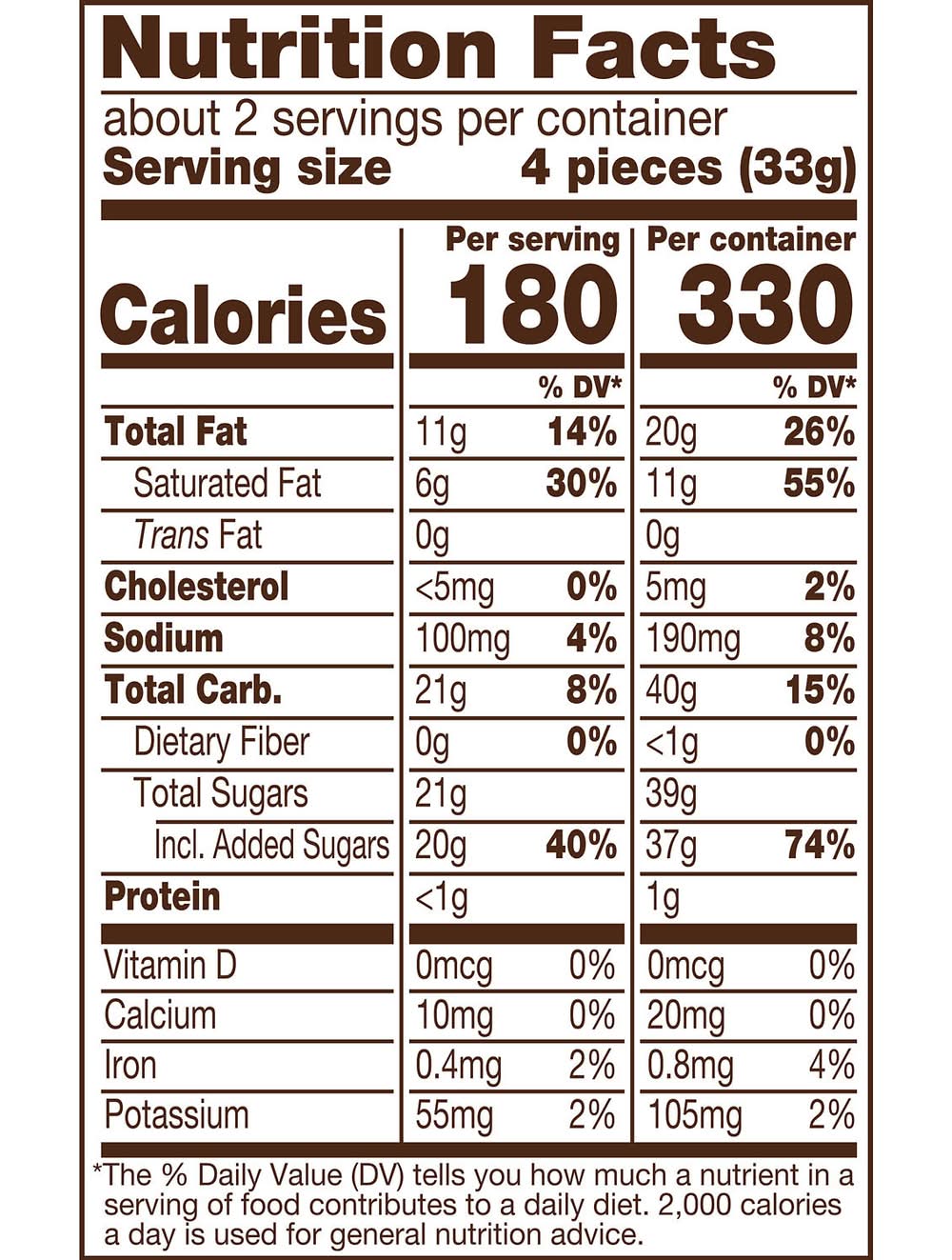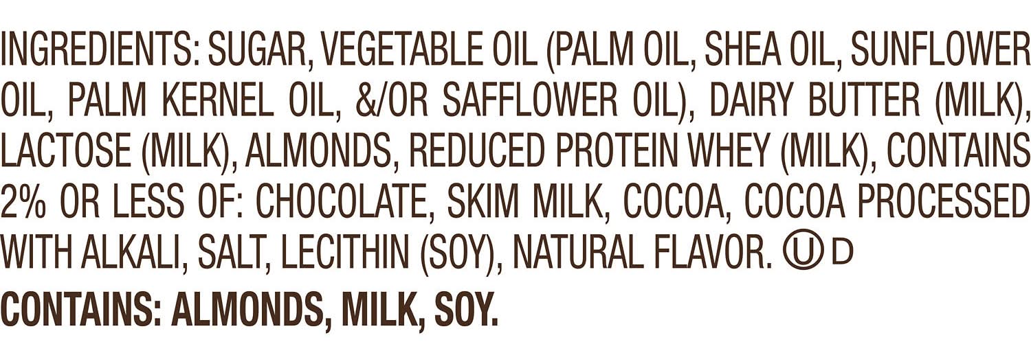 Ingredients: SUGAR, VEGETABLE OIL (PALM OIL, SHEA OIL, SUNFLOWER OIL, PALM KERNEL OIL, /OR SAFFLOWER OIL), DAIRY BUTTER (MILK), LACTOSE (MILK), ALMONDS, REDUCED PROTEIN WHEY (MILK), CONTAINS 2% OR LESS OF: CHOCOLATE, SKIM MILK, COCOA, COCOA PROCESSED WITH ALKALI, SALT, LECITHIN (SOY), NATURAL FLAVOR. Contains: Contains: Almonds, Soy, Milk