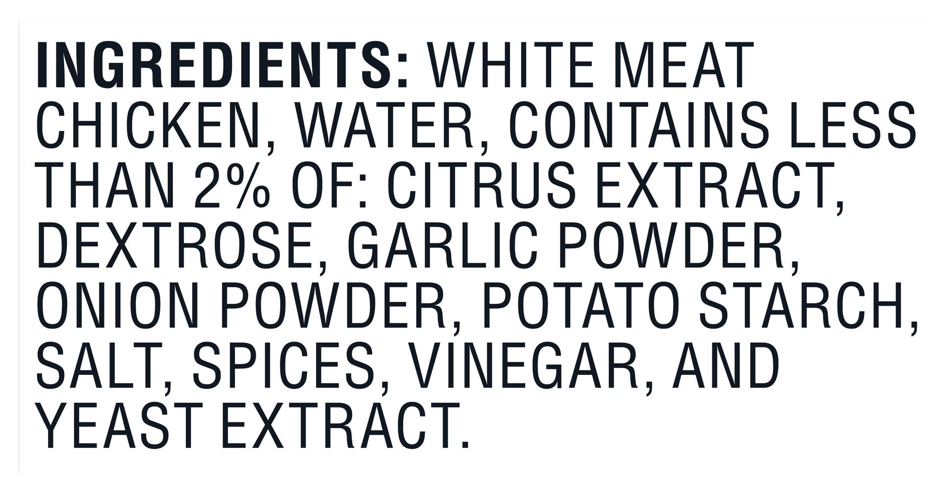 Ingredients: White Meat Chicken, Water, Contains Less than 2% of: Citrus Extract, Dextrose, Garlic Powder, Onion Powder, Potato Starch, Salt, Spices, Vinegar, and Yeast Extract