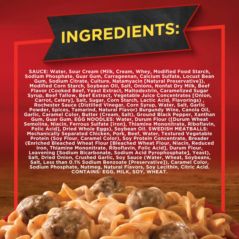 Ingredients: SAUCE: Water, Sour Cream (Milk, Cream, Whey, Modified Food Starch, Sodium Phosphate, Guar Gum, Carrageenan, Calcium Sulfate, Locust Bean Gum, Sodium Citrate, Culture, Natamyacin [Natural Preservative]), Modified Corn Starch, Soybean Oil, Salt, Onions, Nonfat Dry Milk, Beef Flavor (Cooked Beef, Yeast Extract, Maltodextrin, Caramelized Sugar Syrup, Beef Tallow, Beef Extract, Vegetable Juice Concentrates [Onion, Carrot, Celery], Salt, Sugar, Corn Starch, Lactic Acid, Flavorings), Rochester Sauce (Distilled Vinegar, Corn Syrup, Water, Salt, Garlic Powder, Spices, Tamarind, Natural Flavor), Burgundy Wine, Canola Oil, Garlic, Caramel Color, Butter (Cream, Salt), Ground Black Pepper, Xanthan Gum, Guar Gum. EGG NOODLES: Water, Durum Flour ([Durum Wheat Semolina, Niacin, Ferrous Sulfate [Iron], Thiamine Mononitrate, Riboflavin, Folic Acid], Dried Whole Eggs), Soybean Oil. SWEDISH MEATBALLS: Mechanically Separated Chicken, Pork, Beef, Water, Textured Vegetable Protein (Soy Flour, Caramel Color), Soy Protein Concentrate, Breader (Enriched Bleached Wheat Flour [Bleached Wheat Flour, Niacin, Reduced Iron, Thiamine Mononitrate, Riboflavin, Folic Acid], Durum Flour, Leavening [Sodium Bicarbonate, Sodium Acid Pyrophosphate], Yeast), Salt, Dried Onion, Crushed Garlic, Soy Sauce (Water, Wheat, Soybeans, Salt, Less than 0.1% Sodium Benzoate [Preservative]), Caramel Color, Sodium Phosphate, Nutmeg, Natural Flavors, Soy Lecithin, Citric Acid. CONTAINS: EGG, MILK, SOY, WHEAT. Contains: Celery (EU), Egg, Milk, Soy, Wheat