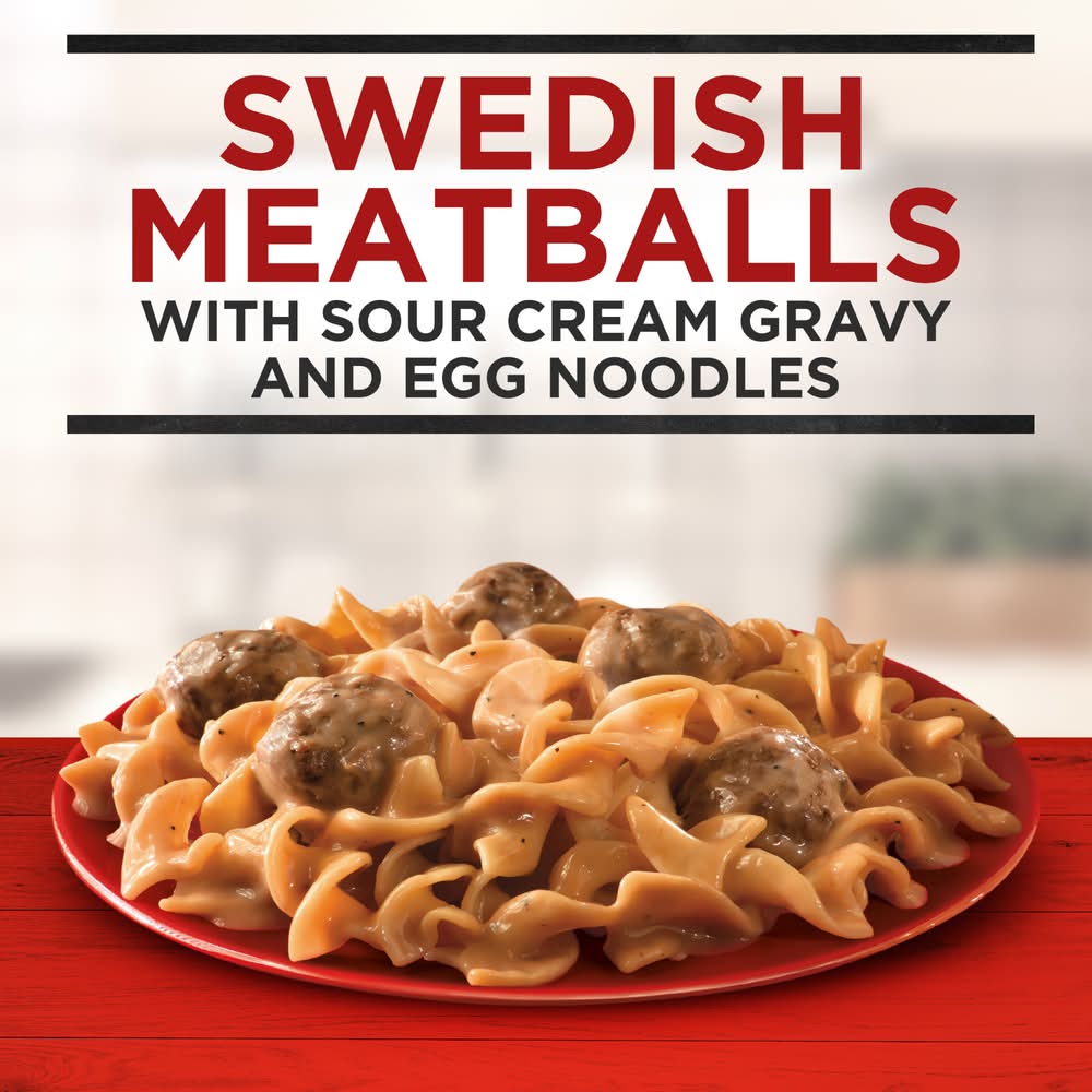 Banquet Swedish Meatballs frozen meal brings the home-cooked flavor to your table in minutes. This frozen dinner features traditional sour cream gravy with Swedish meatballs and egg noodles for delicious ready made meals. Enjoy Banquet frozen meals as convenient frozen lunches, or quick dinners when you're in the mood for meatballs and noodles. Preparation of frozen prepared meals is quick and easy. Follow the instructions on the package to prepare frozen dinners in the oven for fresh-baked taste or microwave for a quicker cook time. Store the 10.45 ounce frozen meatballs and noodles meal in the freezer until you’re ready to enjoy frozen entrees. Proudly made in the U.S.A. for over 60 years, Banquet has been making delicious food the whole family loves. • Size: 10.45 OZ • Packaging: Reusable