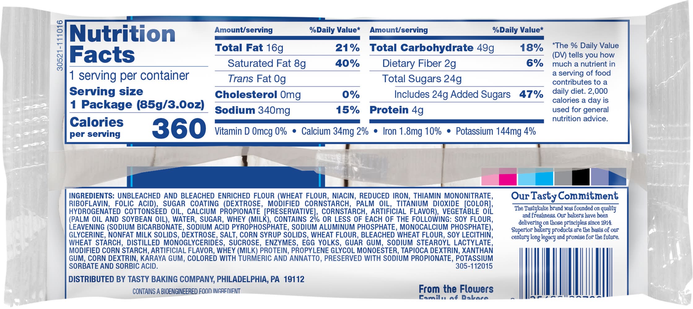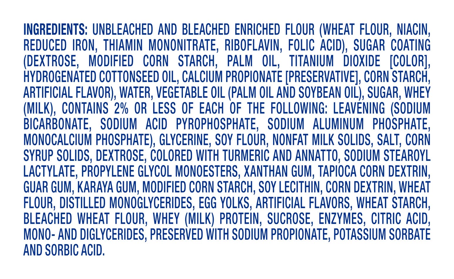 Ingredients: Unbleached and Bleached Enriched Flour (Wheat Flour Niacin Reduced Iron Thiamin Mononitrate Riboflavin Folic Acid), Sugar Coating (Dextrose Modified Corn Starch Palm Oil Titanium Dioxide [Color] Hydrogenated Cottonseed Oil Calcium Propionate [Preservative] Corn Starch Artificial Flavor), Water, Vegetable Oil (Palm Oil and Soybean Oil), Sugar, Whey (Milk), Contains 2% or Less of Each of the Following: Leavening (Sodium Bicarbonate Sodium Acid Pyrophosphate Sodium Aluminum Phosphate Monocalcium Phosphate), Glycerine, Soy Flour, Nonfat Milk Solids, Salt, Corn Syrup Solids, Dextrose, Colored with Turmeric and Annatto, Sodium Stearoyl Lactylate, Propylene Glycol Monoesters, Xanthan Gum, Tapioca Corn Dextrin, Guar Gum, Karaya Gum, Modified Corn Starch, Soy Lecithin, Corn Dextrin, Wheat Flour, Distilled Monoglycerides, Egg Yolks, Artificial Flavors, Wheat Starch, Bleached Wheat Flour, Whey (Milk) Protein, Sucrose, Enzymes, Citric Acid, Mono- and Diglycerides, Preserved with Sodium Propionate, Potassium Sorbate and Sorbic Acid. 305-011723 Contains: Wheat, Milk, Soybeans, Eggs, Corn