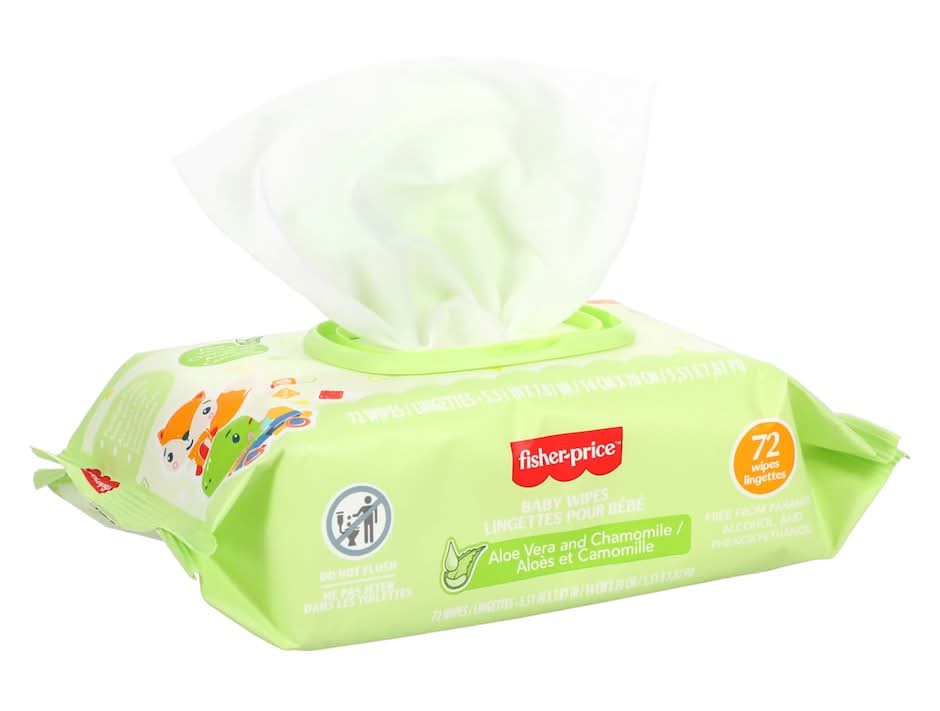 Clean your baby with the Fisher Price Aloe Vera and Chamomile Baby Wipes. These wipes are a safe and perfect choice for your baby as they are free from parabens, alcohol, and chlorine. You can use the soft and durable cloth to wipe your baby's hands, feet, and torso. The wipes come in a small pack with an air-tight lid that keeps them away from germs and harmful bacteria. Please do not dispose of the wipes in the toilet, as it will cause clogging.