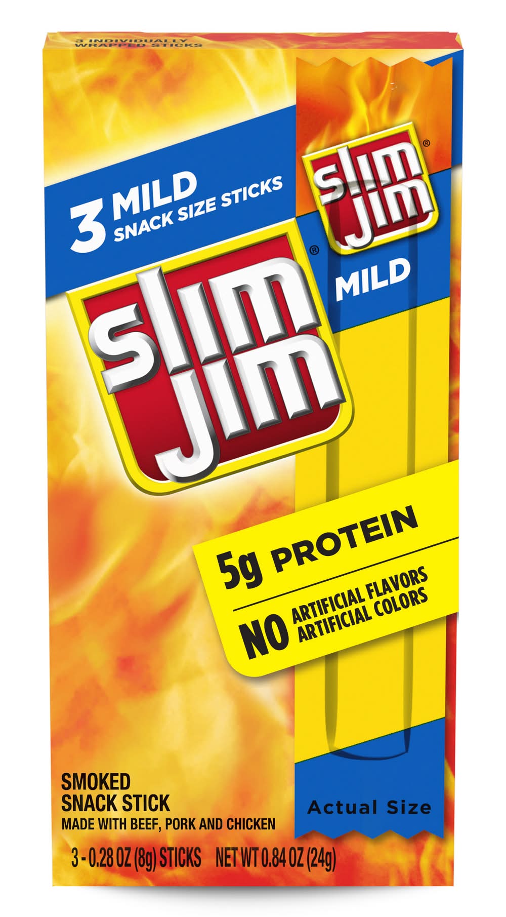 Experience intense, smoky flavor with delicious Slim Jim Snack Sized Mild Meat Sticks. Made with beef, pork and chicken, these snack sticks contain no artificial flavors or colors for full meaty flavor everyone can love. Each 3 meat stick serving is loaded with 5 grams of protein, ideal for protein snacks that kick hunger to the curb and leave you feeling satisfied. These individually wrapped snacks go where you go and are perfect as travel snacks, school snacks or anywhere meat snacks. Slim Jim Snack Sized Mild Meat Sticks offer a bold and tasty way to take on the day. This box contains three individual snacks, so you are ready to hit back when savory cravings hit. Slim Jim keeps it interesting with a full line of beef sticks, snack sticks, pork rinds and jerky. Snap into a Slim Jim®!