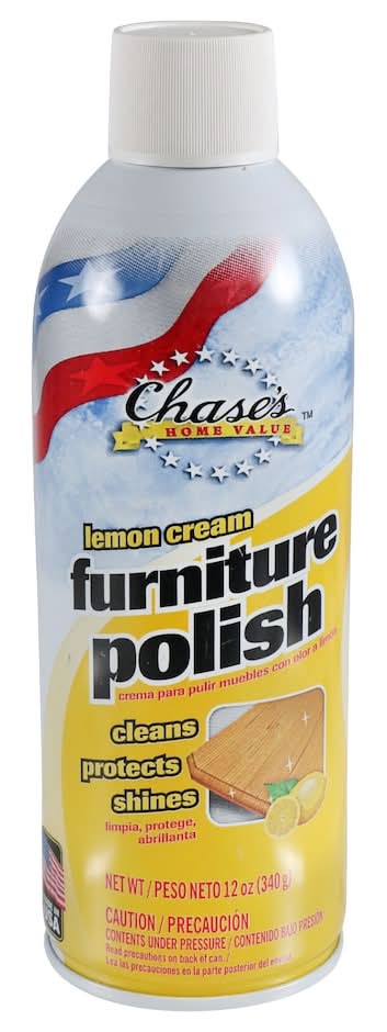 Restore that natural shine to your furniture! Chase's The Home Store Lemon Cream Furniture Polish cleans, protects, and shines while leaving behind a fresh lemony scent. Simply spray some of this product on a surface and wipe it clean with a rag or towel to get rid of dust, dirt, and grime for a sparkling finish you could eat off of. Perfect for use on a variety of surfaces such as furniture, cabinets, paneling, and baseboards. Getting a clean, fresh-smelling home in a flash... what could be better?