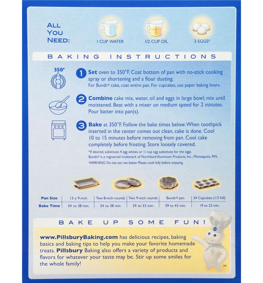All you need: 1 cup water; 1/2 cup oil; 3 eggs (if desired, substitute 4 egg whites or 1/2 cup egg substitute for the eggs). baking instructions: 1 set oven to 350 degrees f. coat bottom of pan with no-stick cooking spray or shortening and a flour dusting. 2 combine cake mix, water, oil and eggs in large bowl; mix until moistened. beat with a mixer on medium speed for 2 minutes. pour batter into pan(s). 3 bake at 350 degrees f. follow the bake times below. when toothpick inserted in the center comes out clean, cake is done. cool 10 to 15 minutes before removing from pan. cool cake completely before frosting. store loosely covered. pan size: 13 x 9-inch; bake time: 34 to 38 min. pan size: two 8-inch rounds; bake time: 34 to 38 min. pan size: two 9-inch rounds; bake time: 29 to 33 min. pan sized: bundt pan; bake time: 39 to 43 min. pan size: 24 cupcakes (1/2 full); bake time: 19 to 23 min. best if used by.