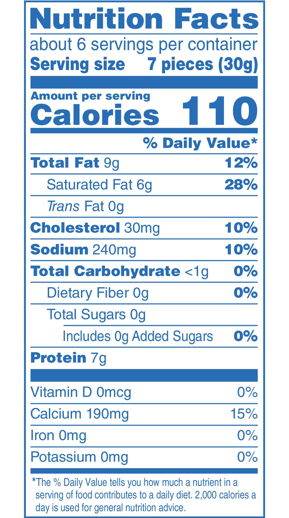 Ingredients: PASTEURIZED MILK, CHEESE CULTURE, SALT, ENZYMES, ANNATTO (COLOR), NATAMYCIN (A NATURAL MOLD INHIBITOR). Contains: CONTAINS: MILK.