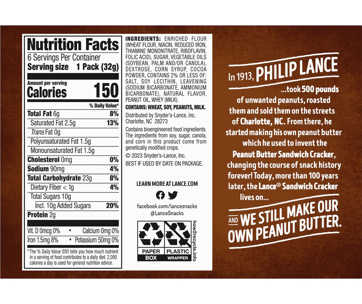 Get ready for a totally tasty treat! With Lance Nekot Fudge sandwich cookies, we combined the best of our delicious cookie treats with the irresistible, creamy flavor of our smooth fudge-flavored filling. All wrapped up in single-serve packs, you get the perfect snack, or an ideal dessert treat. Try them for yourself and see what you’re missing. At Lance, sandwiches mean more: they aren’t just two somethings with whatever in the middle. A Lance sandwich is two awesomes with incredible in the middle — and we’ve made them that way for over 100 years. So, get ready for more of that irresistible goodness that can make any moment immediately better for you. Whether you’re taking a break or need a quick pick-me-up during your day, enjoy the crunch of tasty cookies and smooth fudge flavor that come with the amazing taste you know and love from Lance. Your one and only Lance Sandwich crackers are the king of all sandwich crackers — and cookies. Bring it! Packaging: Reusable