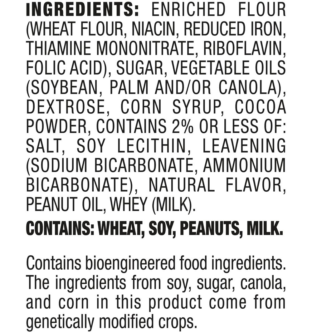 Ingredients: INGREDIENTS: ENRICHED FLOUR (WHEAT FLOUR, NIACIN, REDUCED IRON, THIAMINE MONONITRATE, RIBOFLAVIN, FOLIC ACID), SUGAR, VEGETABLE OILS (SOYBEAN, PALM AND/OR CANOLA), DEXTROSE, CORN SYRUP, COCOA POWDER, CONTAINS 2% OR LESS OF: SALT, SOY LECITHIN, LEAVENING (SODIUM BICARBONATE, AMMONIUM BICARBONATE), NATURAL FLAVOR, PEANUT OIL, WHEY (MILK), . CONTAINS: WHEAT, SOY, PEANUTS, MILK. Contains: CONTAINS: Gluten, Milk/Dairy, Peanut, Soybean, Wheat