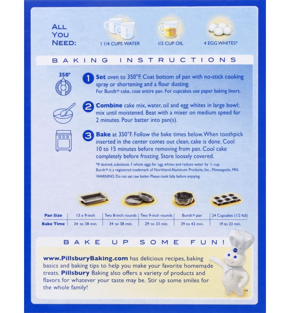 All you need: 1-1/4 cup water; 1/2 cup oil; 4 egg whites (if desired, substitute 3 whole egg whites for white eggs and reduce water 1/4 cup). baking instructions: 1. set oven to 350 degrees f. coat bottom of pan with no-stick cooking spray or shortening and a flour dusting. for bundt cake, coat entire pan. for cupcakes, use paper baking liners; 2. combine cake mix, water, oil and eggs in large bowl; mix until moistened. beat with a mixer on medium speed for 2 minutes. pour batter into pan(s); 3. bake at 350 degrees f. follow the bake times. when toothpick inserted in the center comes out clean, cake is done. cool 10 to 15 minutes before removing from pan. cool cake completely before frosting. store loosely covered. pan size, bake time: 13 x 9-inch, 34 to 38 min.; two 8-inch rounds, 34 to 38 mins; two 9-inch rounds, 29 to 33 min.; bundt pan, 39 to 43 min.; 24 cupcakes (1/2 full), 19 to 23 min.