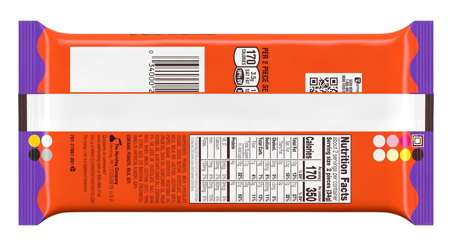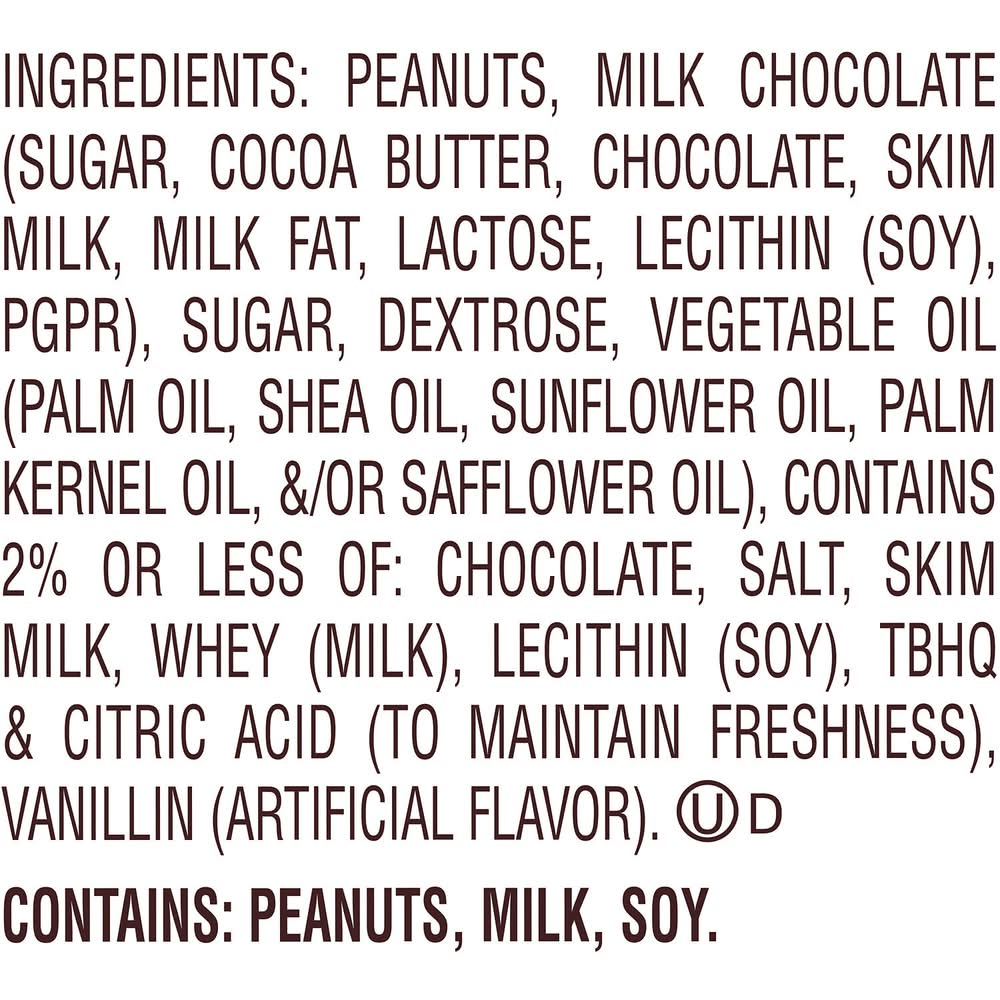 Ingredients: PEANUTS, MILK CHOCOLATE, SUGAR, COCOA BUTTER, CHOCOLATE, SKIM MILK, MILK FAT, LACTOSE, LECITHIN (SOY), PGPR, SUGAR, DEXTROSE, VEGETABLE OIL (PALM OIL, SHEA OIL, SUNFLOWER OIL, PALM KERNEL OIL, /OR SAFFLOWER OIL), CONTAINS 2% OR LESS OF: CHOCOLATE, SALT, SKIM MILK, WHEY (MILK), LECITHIN (SOY), TBHQ CITRIC ACID (TO MAINTAIN FRESHNESS), VANILLIN (ARTIFICIAL FLAVOR), . Contains: Contains: Peanuts|Soy|Milk