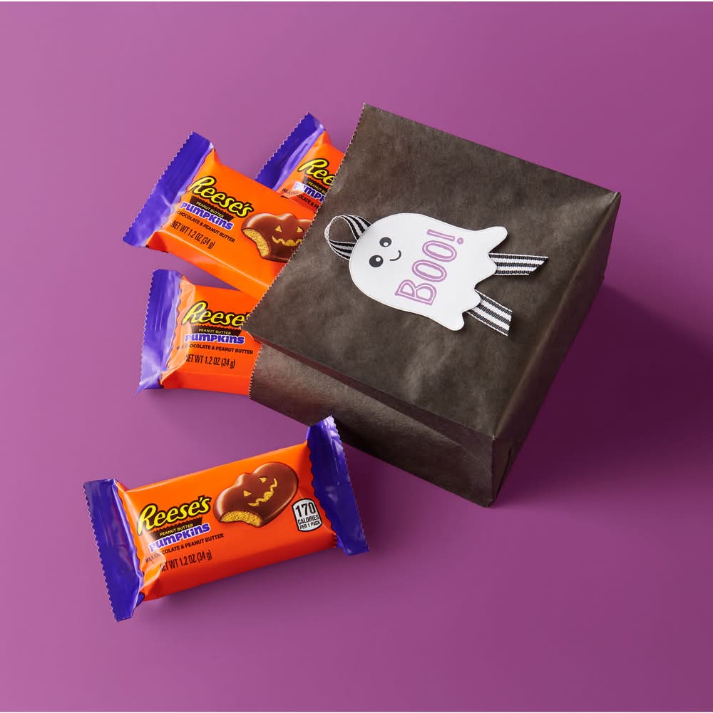 Get ready for a sweet Halloween night with REESE'S milk chocolate peanut butter pumpkins. Yes, it's the same peanut butter and milk chocolate you love but in fun, Halloween shaped designs. Set packs of REESE'S candies out during your next costume party, add to dessert trays for an added touch of peanut butter flavor, have them ready to go for a Halloween movie marathon or give some to trick-or-treaters for a pumpkin shaped surprise sure to delight anyone. REESE'S milk chocolate peanut butter pumpkins are a kosher candy and a sweet delight that you can bite, break, dunk or nibble on. Dunk them into a glass of cold milk, a cup of hot chocolate or to your coffee to experience the melty goodness. Put a unique twist on classic baked goods by incorporating these fun peanut butter shapes into your homemade Halloween treats like cookies, cupcakes or s'mores, or add them as toppers in your delicious ice cream sundae bar. Wrap your favorite cookie dough around these shapes to create a melty surprise or add icing to each REESE'S Halloween candy for extra fear, fun and festivity. It's the kind of decorating you can eat no matter how it turns out! With pumpkin shaped candies on hand, your Halloween is sure to become deliciously fun. • Flavor: Peanut butter • Packaging: Reusable