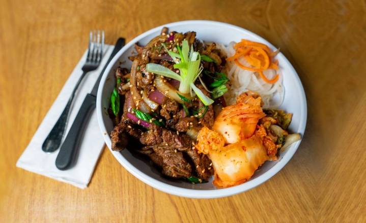Ribeye steak marinated in our home-made Bulgogi Sauce and served with a side of spicy Kimchi and sweet Daikon Salad for an unexpected flavor party in your mouth.
