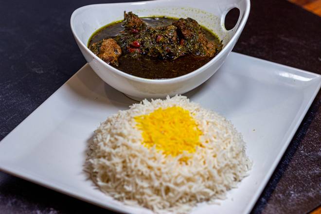 Fresh green herbs sauteed, cooked with kidney beans, sun-dried lime, and tendered chunks of beef. Served with basmati rice.