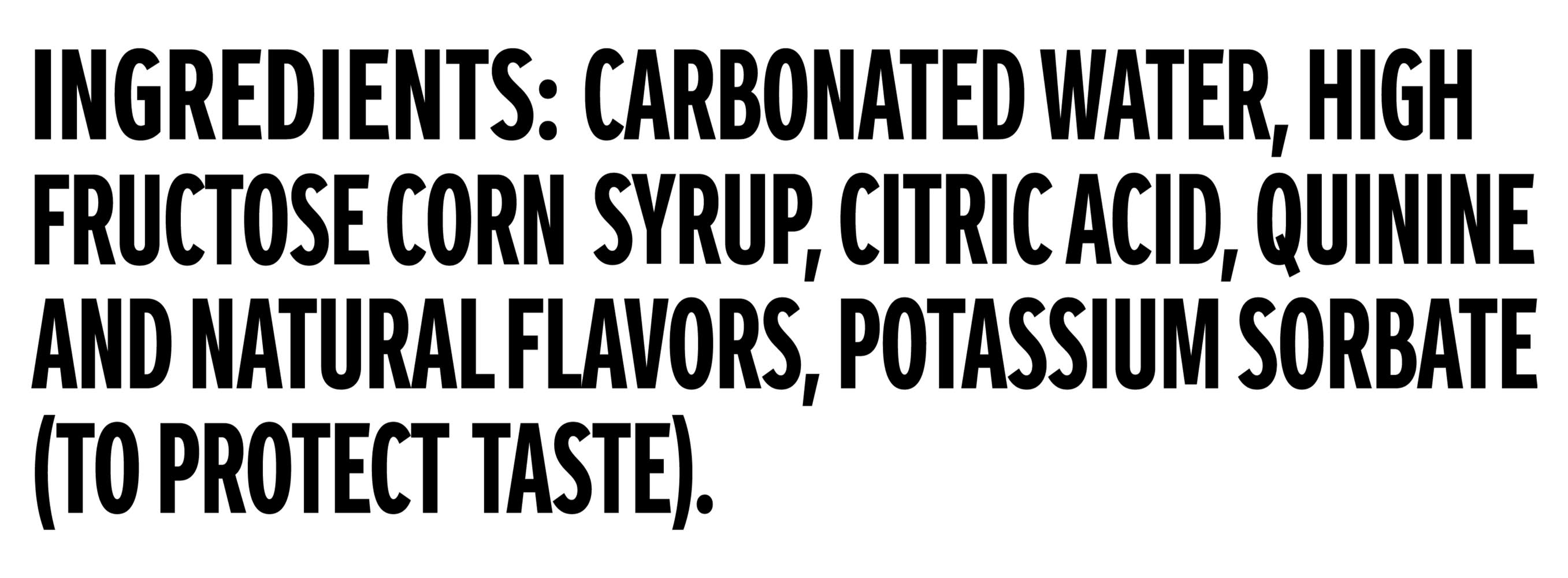 Ingredients: Carbonated Water, High Fructose Corn Syrup, Citric Acid, Quinine And Natural Flavors, Potassium Sorbate (To Protect Taste). Contains: Corn