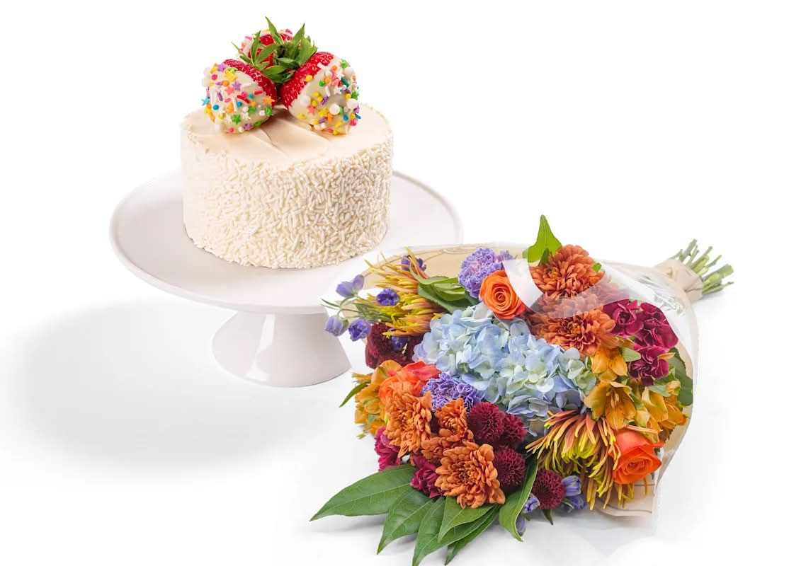 Choose a celebratory duo that fits their style and celebration. Select between our vanilla confetti cake with dipped berries or our classic birthday vanilla confetti cake with candles. Then, add a gorgeous floral bouquet or arrangement for a beautifully special moment.