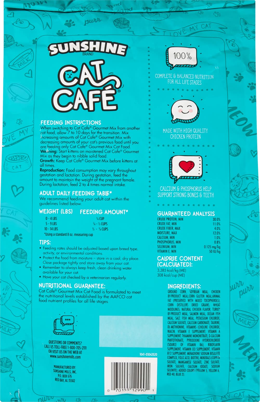 Usage of instructions:feeding instructions: when switching to cat cafe gourmet mix from another cat food, allow 7 to 10 days for the transition. mix increasing amounts of cat cafe gourmet mix with decreasing amounts of your cat's previous food until you are feeding only cat cafe gourmet mix cat food. weaning: start kittens on moistened cat cafe gourmet mix as they begin to nibble solid food. growth: keep cat cafe gourmet mix before kittens at all times. reproduction: food consumption may vary throughout gestation and lactation. during gestation, feed the amount to maintain the weight of the pregnant female. during lactation, feed 2 to 4 times normal intake. adult daily feeding table (using a standard 8 oz measuring cup). we recommend feeding your adult cat within the guidelines listed below. weight: 0 - 4 lbs: feeding amount (using a standard 8 oz measuring cup): 1/4 cup; weight: 5 - 9 lbs: feeding amount (using a standard 8 oz measuring cup): 1/4 - 1/2 cups; weight: 10 -1 4 lbs: feeding amount (using a standard 8 oz measuring cup): 1/2 - 3/4 cups. tips: feeding rates should be adjusted based upon breed type, activity, or environmental conditions. protect the food from moisture - store in a cool, dry place. close package tightly and store away from your cat. remember to always keep fresh, clean drinking water available for your cat. have your cat checked by a veterinarian regularly. - directions: feeding instructions: when switching to cat cafe gourmet mix from another cat food, allow 7 to 10 days for the transition. mix increasing amounts of cat cafe gourmet mix with decreasing amounts of your cat's previous food until you are feeding only cat cafe gourmet mix cat food. weaning: start kittens on moistened cat cafe gourmet mix as they begin to nibble solid food. growth: keep cat cafe gourmet mix before kittens at all times. reproduction: food consumption may vary throughout gestation and lactation. during gestation, feed the amount to maintain the weight of the pregnant female. during lactation, feed 2 to 4 times normal intake. adult daily feeding table (using a standard 8 oz measuring cup). we recommend feeding your adult cat within the guidelines listed below. weight: 0 - 4 lbs: feeding amount (using a standard 8 oz measuring cup): 1/4 cup; weight: 5 - 9 lbs: feeding amount (using a standard 8 oz measuring cup): 1/4 - 1/2 cups; weight: 10 -1 4 lbs: feeding amount (using a standard 8 oz measuring cup): 1/2 - 3/4 cups. tips: feeding rates should be adjusted based upon breed type, activity, or environmental conditions. protect the food from moisture - store in a cool, dry place. close package tightly and store away from your cat. remember to always keep fresh, clean drinking water available for your cat. have your cat checked by a veterinarian regularly.