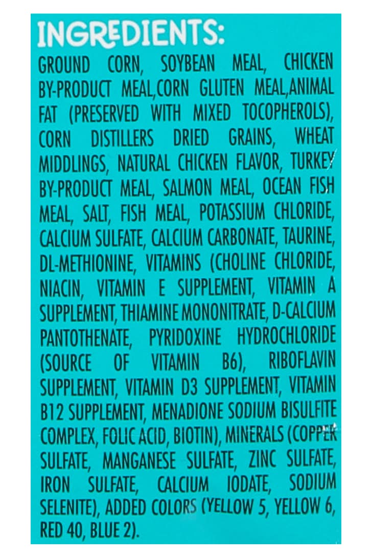 Ingredients: Ground Corn, Soybean Meal Chicken By-Product Meal, Corn Gluten Meal, Animal Fat (Preserved with Mixed Tocopherols), Corn Distillers Dried Grains, Wheat Middlings, Natural Chicken Flavor, Turkey By-Product Meal, Salmon Meal, Ocean Fish Meal, Salt, Fish Meal, Potassium Chloride, Calcium Sulfate, Calcium Carbonate, Taurine, DL-Methionine, Vitamins (Choline Chloride, Niacin, Vitamin E Supplement, Vitamin A Supplement, Thiamine Mononitrate, D-Calcium Pantothenate, Pyridoxine Hydrochloride (Source of Vitamin B6), Riboflavin Supplement, Vitamin D3 Supplement, Vitamin B12 Supplement, Menadione Sodium Bisulfite Complex, Folic Acid, Biotin), Minerals (Copper Sulfate, Manganese Sulfate, Zinc Sulfate, Iron Sulfate, Calcium Iodate, Sodium Selenite), Added Colors (Yellow 5, Yellow 6, Red 40, Blue 2) Contains: Soybeans, Gluten, Wheat, Fish