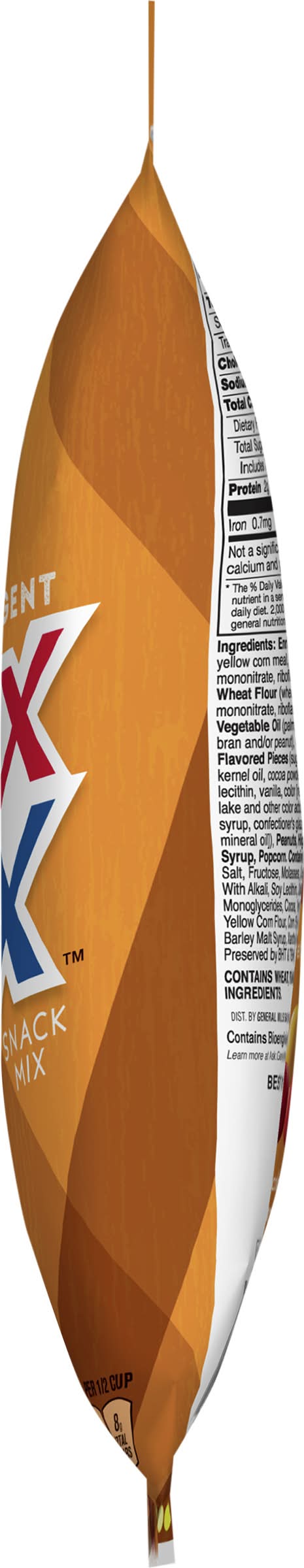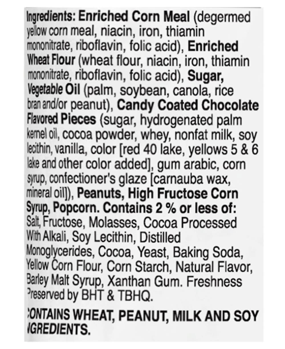 Ingredients: Enriched Corn Meal (Degermed Yellow Corn Meal, Niacin, Iron, Thiamin Mononitrate, Riboflavin, Folic Acid), Enriched Wheat Flour (Wheat Flour, Niacin, Iron, Thiamin Mononitrate, Riboflavin, Folic Acid), Sugar, Vegetable Oil (Palm, Soybean, Canola, Rice Bran and/or Peanut), Candy Coated Chocolate Flavored Pieces (Sugar, Hydrogenated Palm Kernel Oil, Cocoa Powder, Whey, Nonfat Milk, Soy Lecithin, Vanilla, Color [Red 40 Lake, Yellows 5 & 6 Lake and Other Color Added], Gum Arabic, Corn Syrup, Confectioner's Glaze [Carnauba Wax, Mineral Oil]), Peanuts, High Fructose Corn Syrup, Popcorn. Contains 2% or Less of: Salt, Fructose, Molasses, Cocoa Processed with Alkali, Soy Lecithin, Distilled Monoglycerides, Cocoa, Yeast, Baking Soda, Yellow Corn Flour, Corn Starch, Natural Flavor, Barley Malt Syrup, Xanthan Gum. Freshness Preserved by BHT & TBHQ Contains: Wheat, Peanuts, Milk, Soybeans, Barley