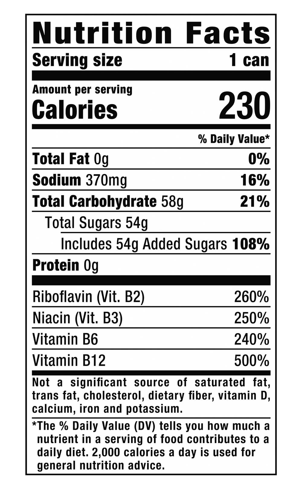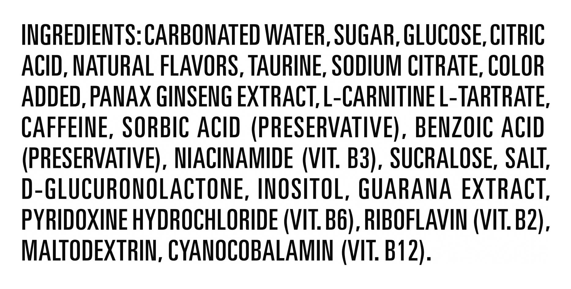 Ingredients: Carbonated Water, Sugar, Glucose, Citric Acid, Natural Flavors, Taurine, Sodium Citrate, Color Added, Panax Ginseng Extract, L-Carnitine L-Tartrate, Caffeine, Sorbic Acid (Preservative), Benzoic Acid (Preservative), Niacinamide (Vit. B3), Sucralose, Salt, D-Glucuronolactone, Inositol, Guarana Extract, Pyridoxine Hydrochloride (Vit. B6), Riboflavin (Vit. B2), Maltodextrin, Cyanocobalamin (Vit. B12). Monster Energy Blend: Glucose, Taurine, Panax Ginseng Extract, L-Carnitine, Caffeine, Glucuronolactone, Inositol, Guarana Extract, Maltodextrin