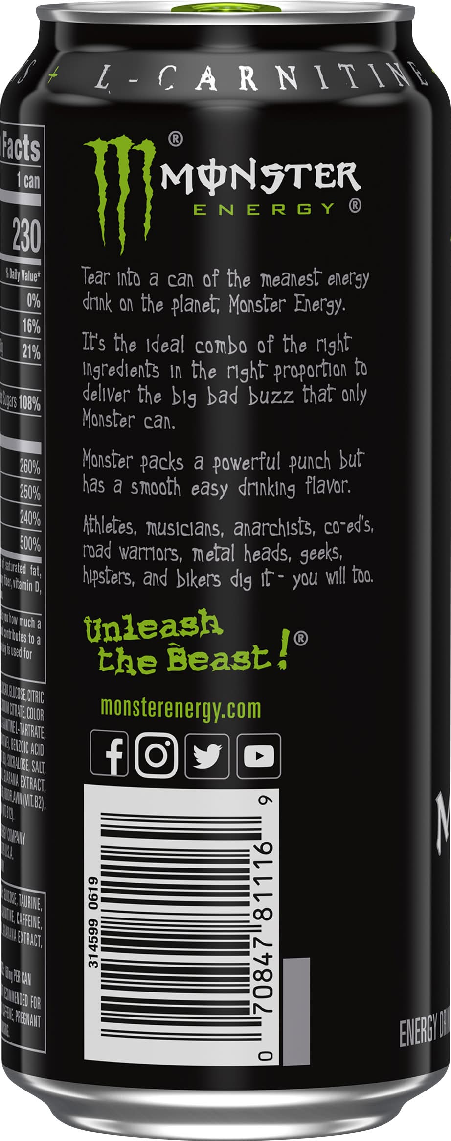 Tear into a can of the meanest energy drink on the planet, Monster Energy. It's the ideal combo of the right ingredients in the right proportion to deliver the big bad buzz that only Monster can. Monster packs a powerful punch but has a smooth easy drinking flavor. Athletes, musicians, anarchists, co-ed's, road warriors, metal heads, geeks, hipsters, and bikers dig it - you will too. Monster Beverage, 1 Monster Way Corona, CA 92879