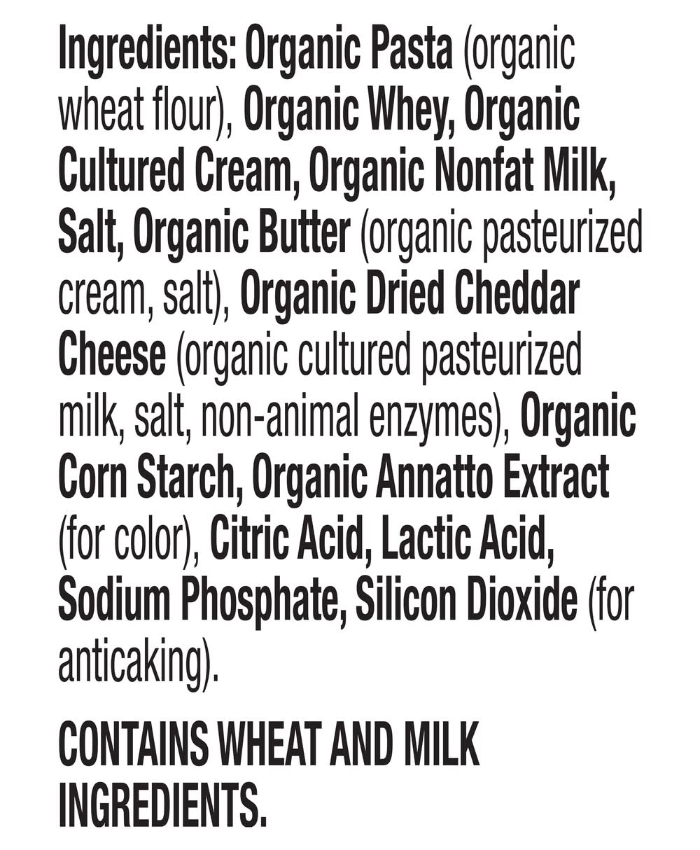 Ingredients: Organic Pasta (Organic Wheat Flour), Organic Whey, Organic Cultured Cream, Organic Nonfat Milk, Salt, Organic Butter (Organic Pasteurized Cream, Salt), Organic Dried Cheddar Cheese (Organic Cultured Pasteurized Milk, Salt, Non-Animal Enzymes), Organic Corn Starch, Organic Annatto Extract (for Color), Citric Acid, Lactic Acid, Sodium Phosphate, Silicon Dioxide (for Anticaking) Contains: Wheat, Milk