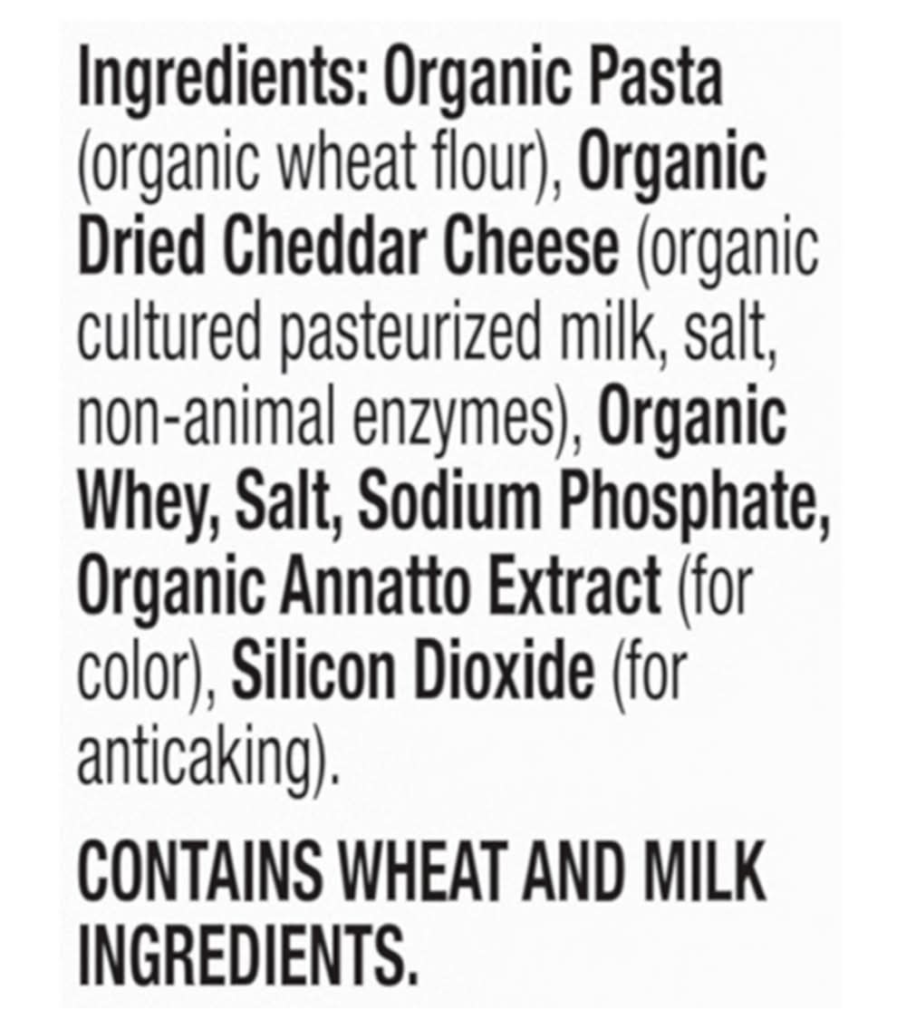 Ingredients: Organic Pasta (Organic Wheat Flour), Organic Dried Cheddar Cheese (Organic Cultured Pasteurized Milk, Salt, Non-Animal Enzymes), Organic Whey, Salt, Sodium Phosphate, Organic Annatto Extract (for Color), Silicon Dioxide (for Anticaking) Contains: Wheat, Milk