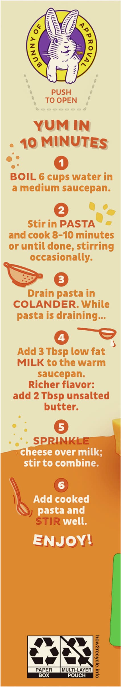 Directions for use: Yum in 10 minutes. 1. Boil 6 cups water in a medium saucepan. 2. Stir in pasta and cook 8-10 minutes or until done, stirring occasionally. 3. Drain pasta in colander. While pasta is draining. 4. Add 3 Tbsp low fat milk to the warm saucepan. Richer flavor: Add 2 tbsp unsalted butted. 5. Sprinkle cheese over milk; stir to combine. 6. Add cooked pasta and stir well. Enjoy Store in a cool, dry place. Push to open. Storage recommendation: Store in a cool, dry place.