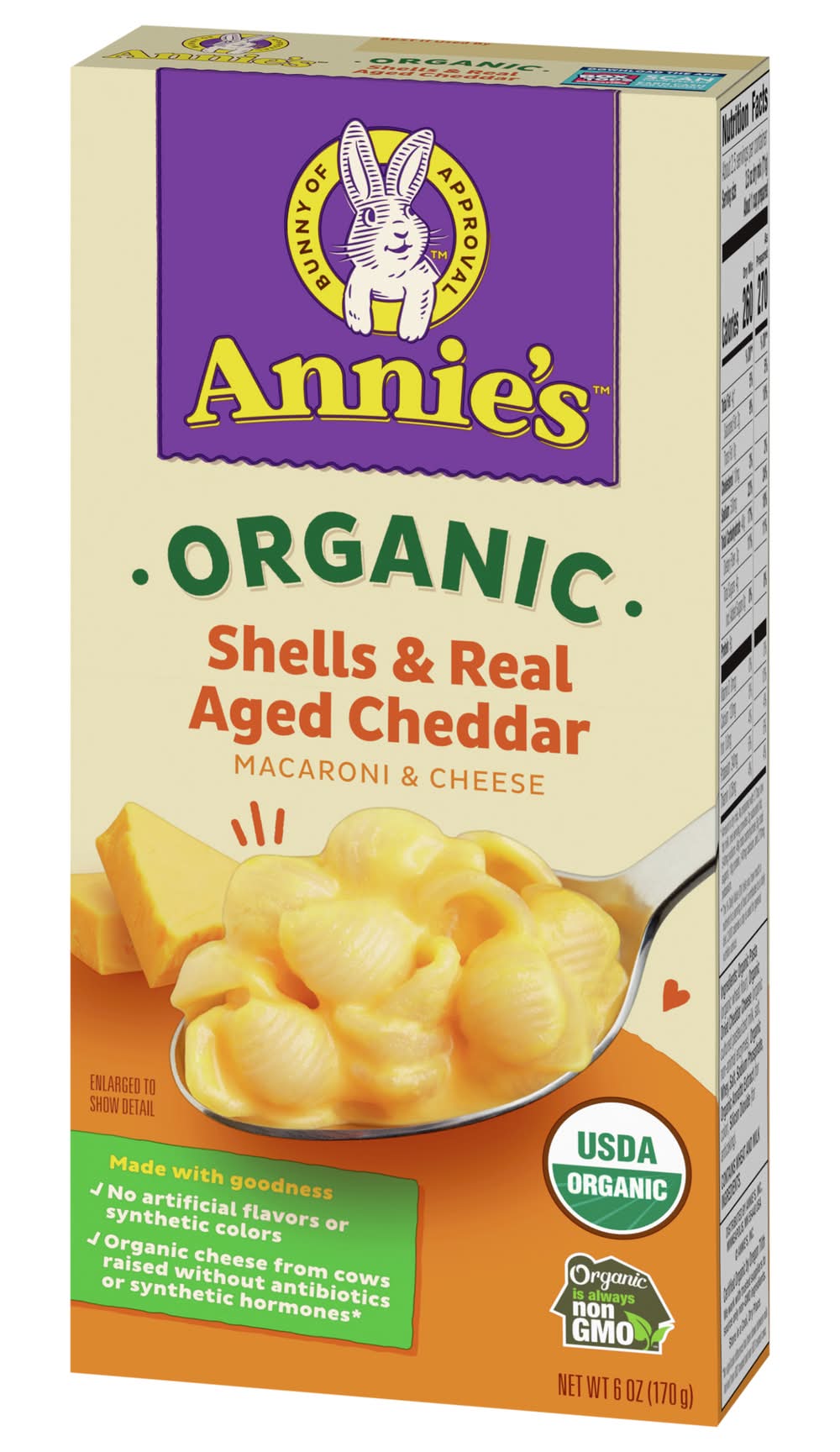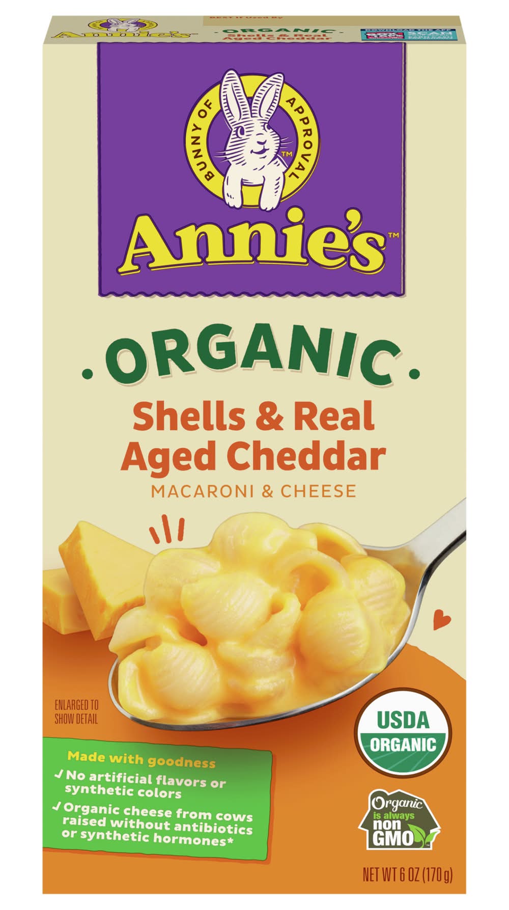 Macaroni & Cheese, Organic, Shells & Real Aged Cheddar • Flavor: Aged cheddar • Annie's, Inc., Minneapolis, MN, 55440 • Packaging: Reusable