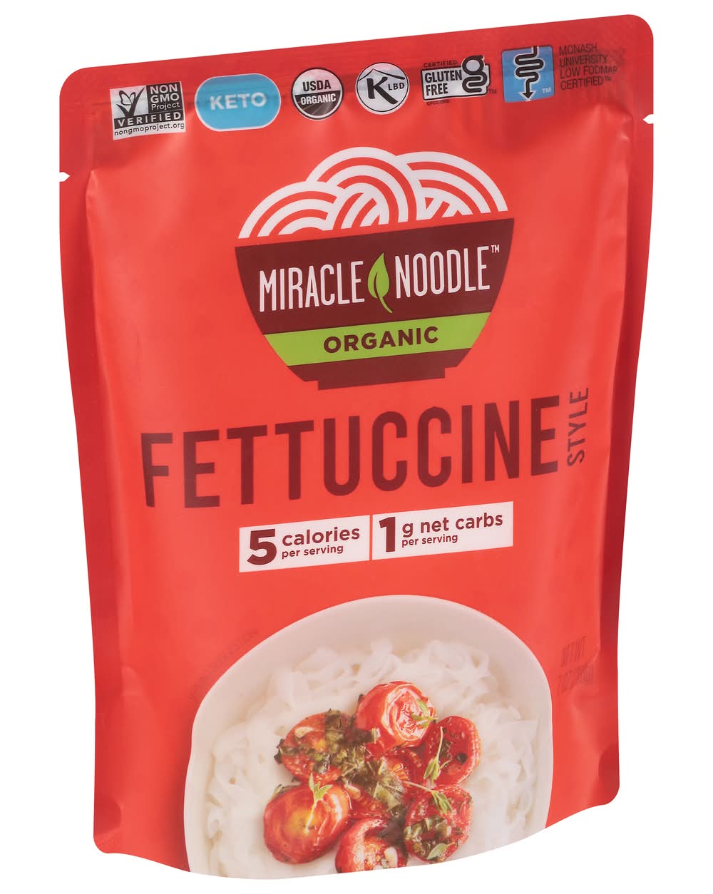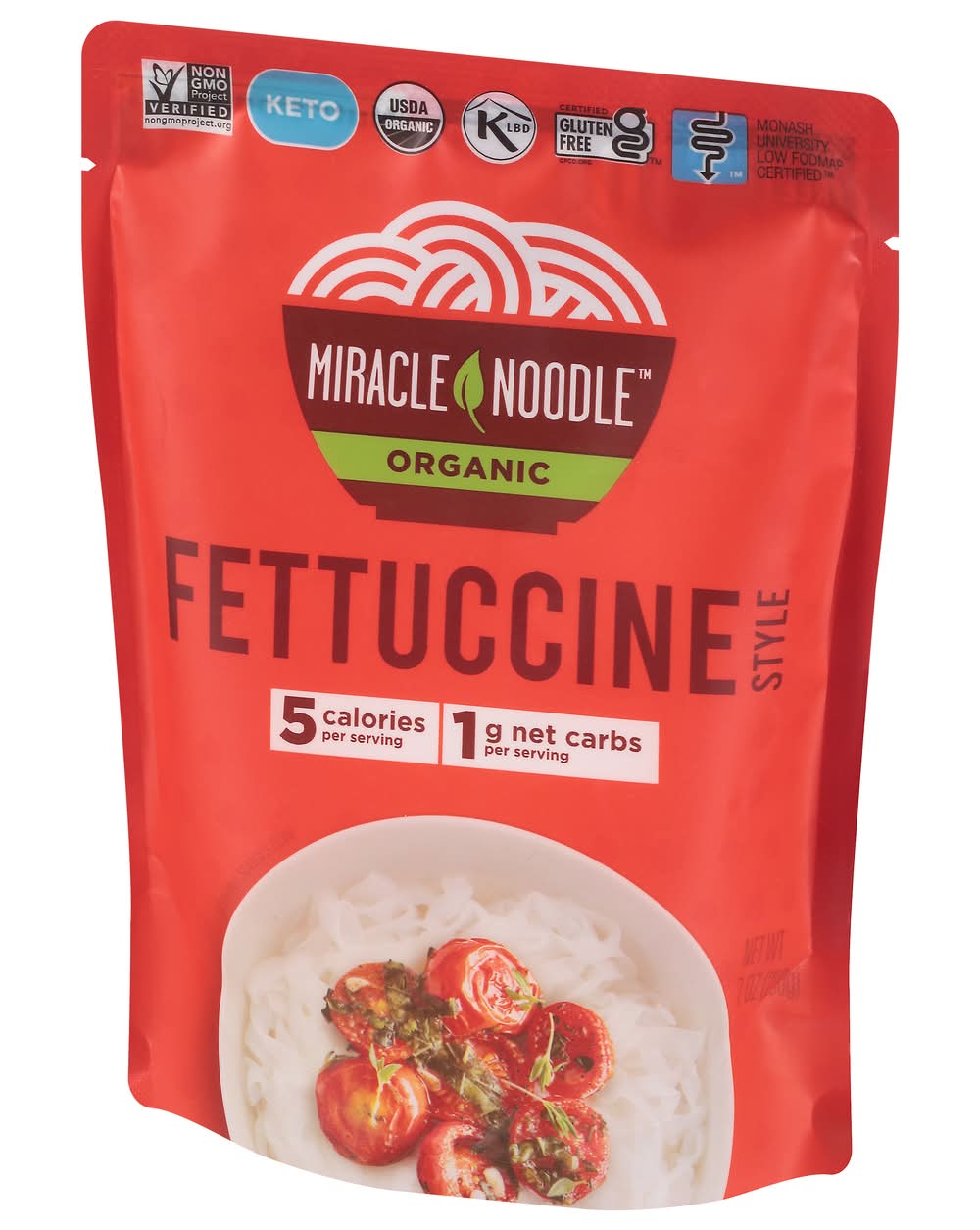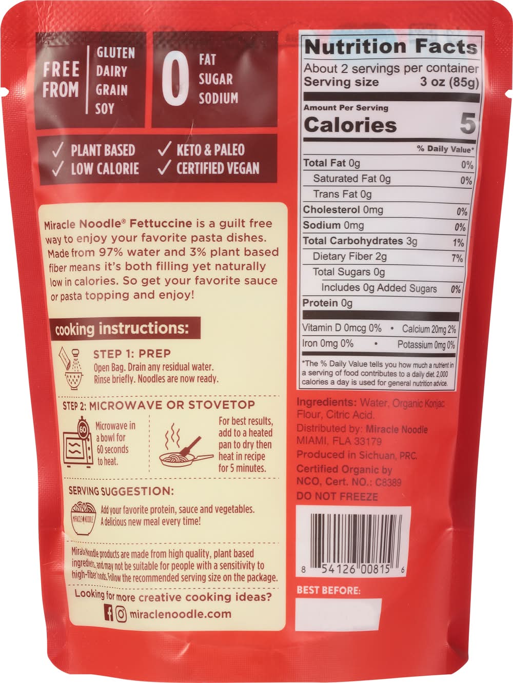 5 calories per serving. 1 g net carbs per serving. USDA Organic. Certified gluten free. gfco.org. Free From: Gluten; Dairy; Grain; Soy. 0 Fat, sugar, sodium. Certified vegan. Certified Organic by NCO. Low calorie. Paleo. Non-GMO Project verified. nongmoproject.org. Miracle Noodle Fettuccine is a guilt free way to enjoy your favorite pasta dishes. Made from 97% water and 3% plant based fiber means it's both filling yet naturally low in calories. So get your favorite sauce or pasta topping and enjoy! Miracle Noodle products are made from high quality, plant based ingredients, and may not be suitable for people with a sensitivity to high-fiber foods. Follow the recommended serving size on the package. Monash University Low Fodmap Certified. miraclenoodle.com. Facebook. Instagram. Looking for more creative cooking ideas? miraclenoodle.com. Produced in Sichuan, PRC. Number of servings: 2
