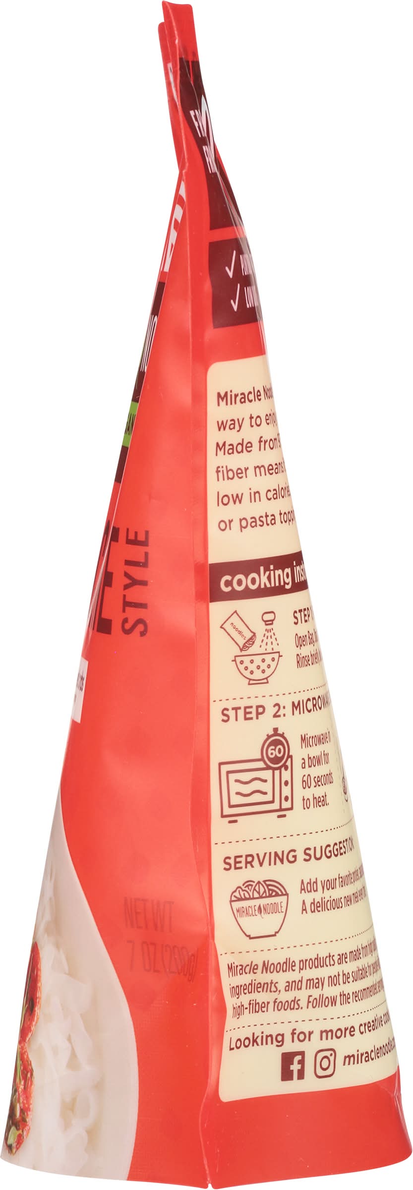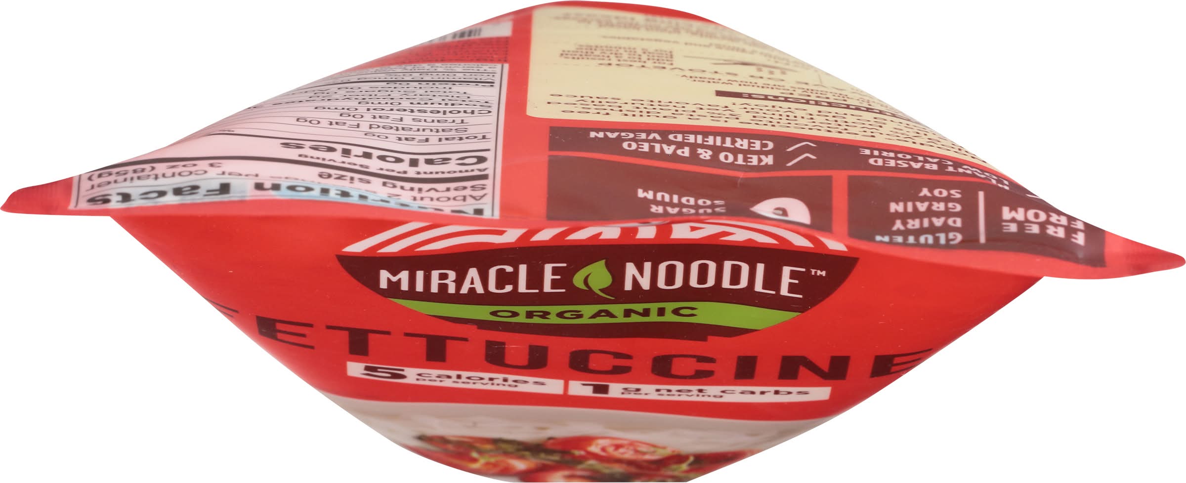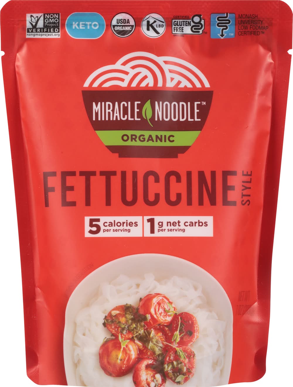 5 calories per serving. 1 g net carbs per serving. USDA Organic. Certified gluten free. gfco.org. Free From: Gluten; Dairy; Grain; Soy. 0 Fat, sugar, sodium. Certified vegan. Certified Organic by NCO. Low calorie. Paleo. Non-GMO Project verified. nongmoproject.org. Miracle Noodle Fettuccine is a guilt free way to enjoy your favorite pasta dishes. Made from 97% water and 3% plant based fiber means it's both filling yet naturally low in calories. So get your favorite sauce or pasta topping and enjoy! Miracle Noodle products are made from high quality, plant based ingredients, and may not be suitable for people with a sensitivity to high-fiber foods. Follow the recommended serving size on the package. Monash University Low Fodmap Certified. miraclenoodle.com. Facebook. Instagram. Looking for more creative cooking ideas? miraclenoodle.com. Produced in Sichuan, PRC. Number of servings: 2