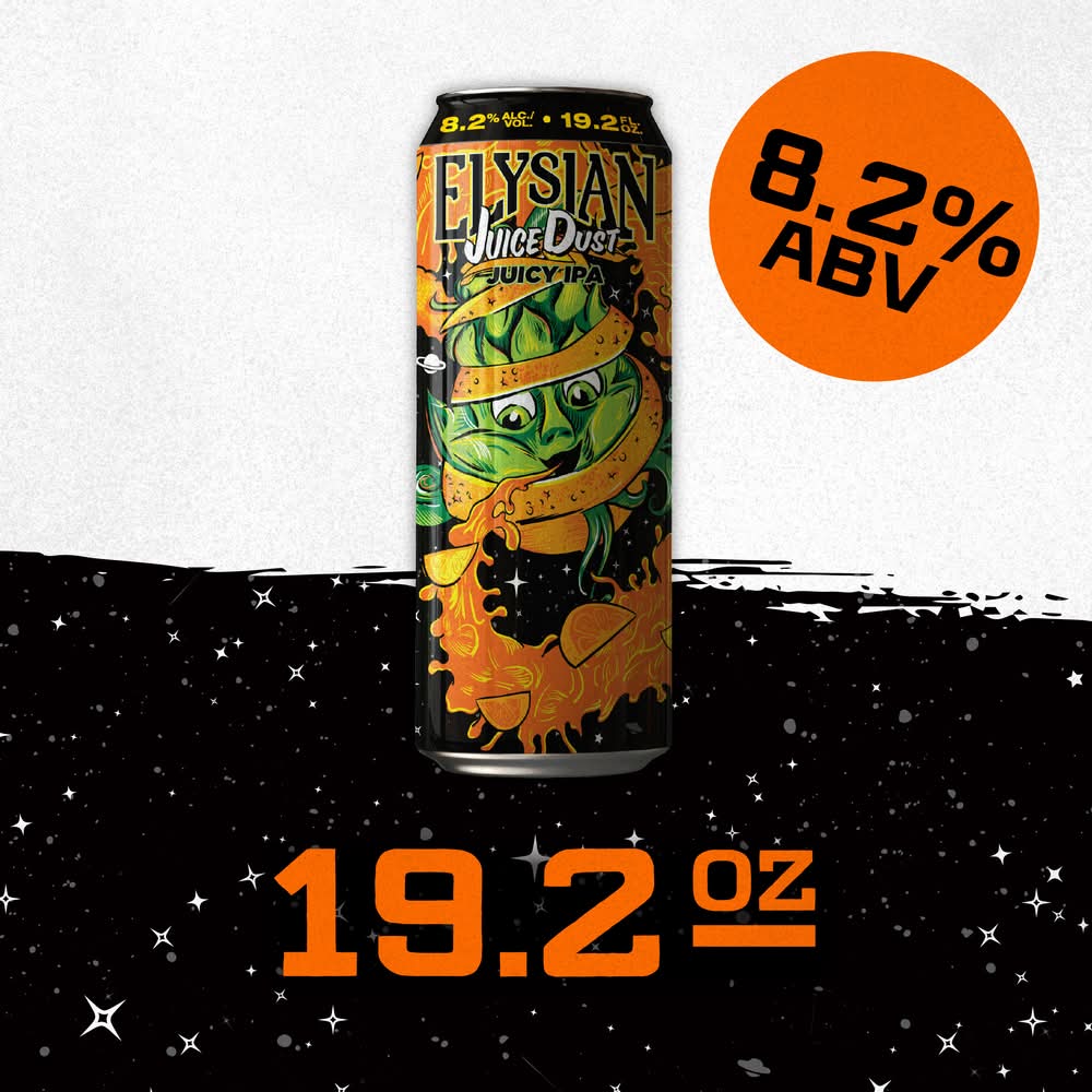 Powered by vibrant bursts of real orange juice, Juice Dust IPA corkscrews through space on waves of citrus and notes of sweet tropical fruit. Elysian Brewing Juice Dust Juicy IPA Craft Beer, 6-Pack 12 fl. oz cans. 8.2% Alcohol by volume. Drink responsibly. Elysian Brewing Juice Dust Juicy IPA Craft Beer. With a familiar hop profile and mischievous drinkability, each variation in the Space Dust Series earns the right to carry the name of our most iconic IPA. Join us in exploring the multidimensional flavors of the Dust universe. Alcohol by volume: 8.19%