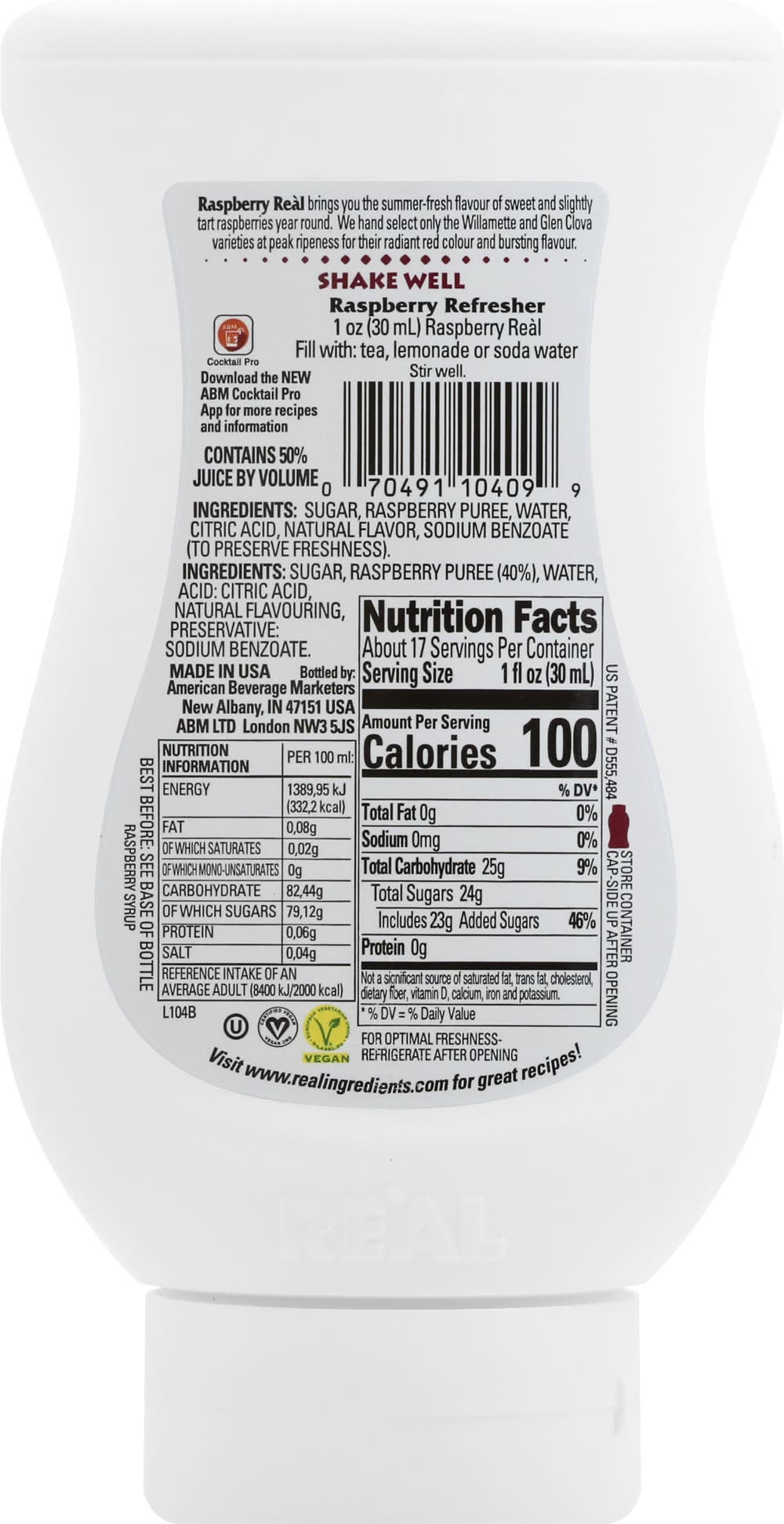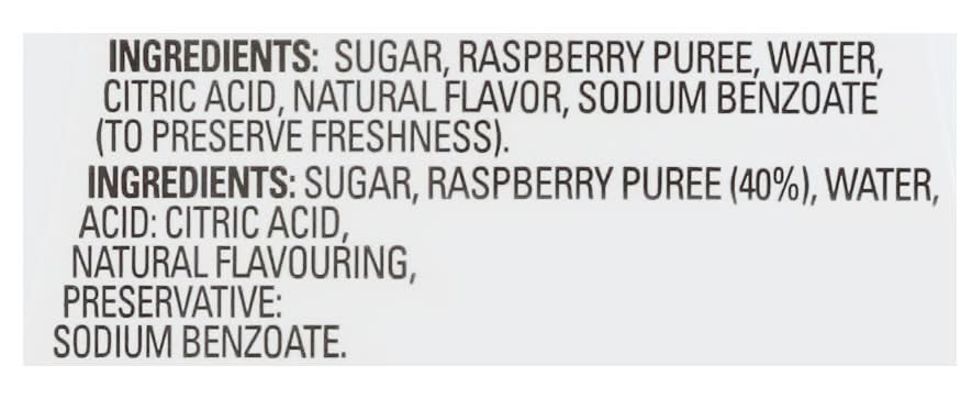Ingredients: Sugar, Raspberry Puree, Water, Citric Acid, Natural Flavor, Sodium Benzoate (to Preserve Freshness). Sugar, Raspberry Puree (40 %), Water, Acid: Citric Acid, Natural Flavouring, Preservative: Sodium Benzoate