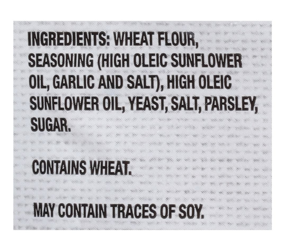 Ingredients: Wheat Flour, Seasoning (High Oleic Sunflower Oil, Garlic and Salt), High Oleic Sunflower Oil, Yeast, Salt, Parsley, Sugar Contains: Wheat, Soybeans