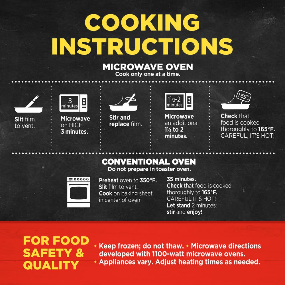 Directions for use: For food safety and quality: Keep frozen. Do not thaw. Microwave directions developed with 1100-watt microwave ovens. Appliances vary. Adjust cooking times as needed. Food must be cooked thoroughly to 165 degrees F. Read and follow these cooking directions. Microwave Oven: Cook only one at a time. Slit film to vent. Microwave on high 3 minutes. Stir and replace film. Microwave an additional 1 to 1 minutes. Check that food is cooked thoroughly to 165 degrees F. Careful, it's hot! Let stand 2 minutes; stir and enjoy! Conventional Oven: Do not prepare in toaster oven. Preheat oven to 350 degrees F. Slit film to vent. Cook on baking sheet in center of oven 32 to 35 minutes. Check that food is cooked thoroughly to 165 degrees F. Careful, it's hot! Let stand 2 minutes; stir and enjoy! Keep frozen. Storage recommendation: Keep frozen.