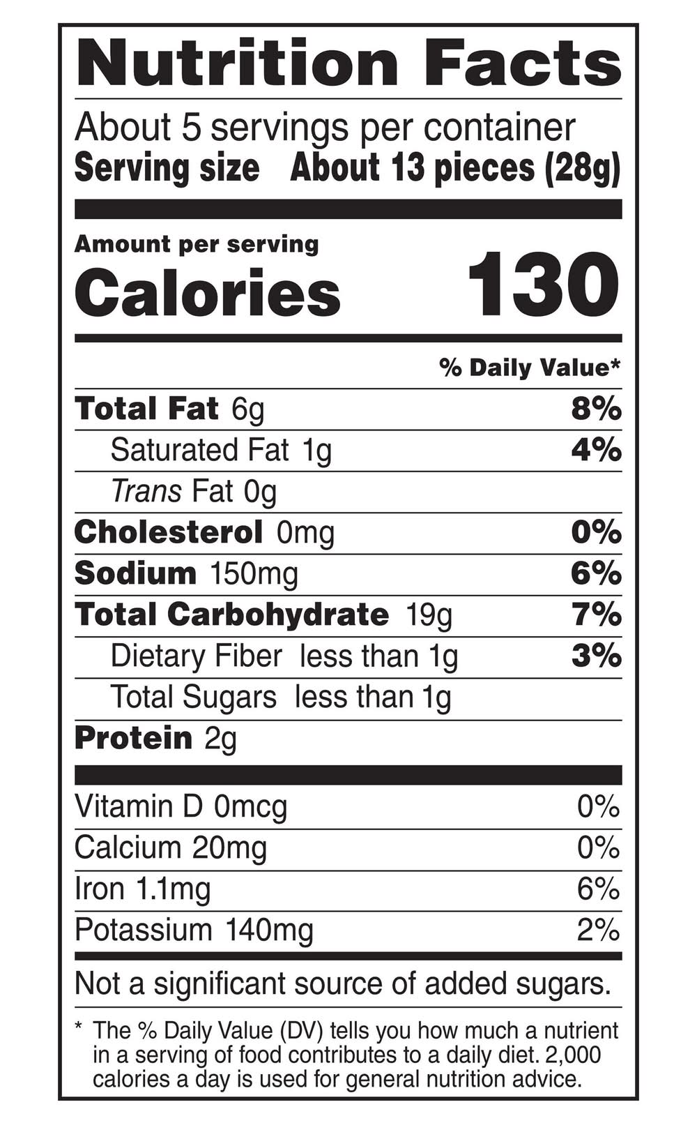 Ingredients: Enriched Corn Meal (Corn Meal, Ferrous Sulfate, Niacin, Thiamin Mononitrate, Riboflavin, Folic Acid), Vegetable Oil (Corn, Canola, and/or Sunflower Oil), Corn Maltodextrin, and Less than 2% of Corn Starch, Corn Flour, Salt, Buttermilk, Potassium Salt, Garlic Powder, Monosodium Glutamate, Spices, Natural Flavors, Onion Powder, Sour Cream (Cultured Cream, Skim Milk), and Yeast Extract Contains: Milk