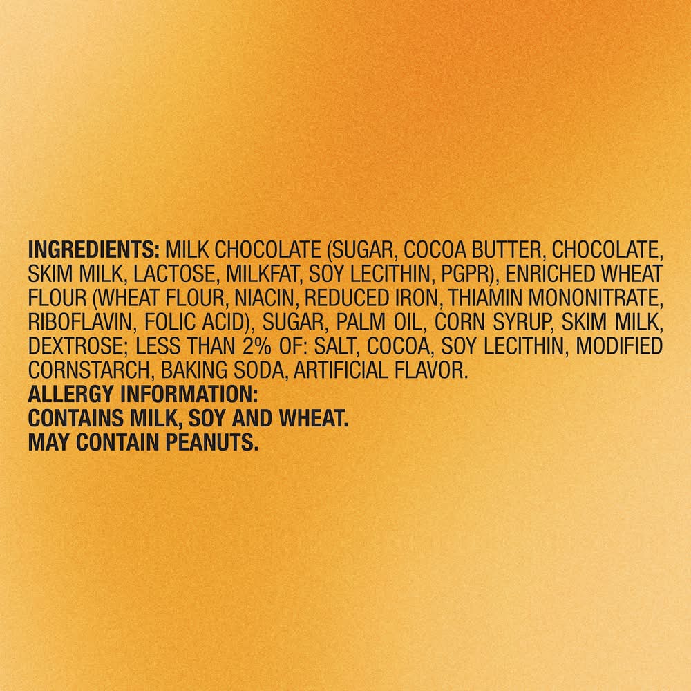 Ingredients: Milk Chocolate (Sugar Cocoa Butter Chocolate Skim Milk Lactose Milkfat Soy Lecithin PGPR), Enriched Wheat Flour (Wheat Flour Niacin Reduced Iron Thiamin Mononitrate Riboflavin Folic Acid), Sugar, Palm Oil, Corn Syrup, Skim Milk, Dextrose; Less than 2% of: Salt, Cocoa, Soy Lecithin, Modified Cornstarch, Baking Soda, Artificial Flavor Contains: Milk, Lactose, Soybeans, Wheat, Corn, Peanuts