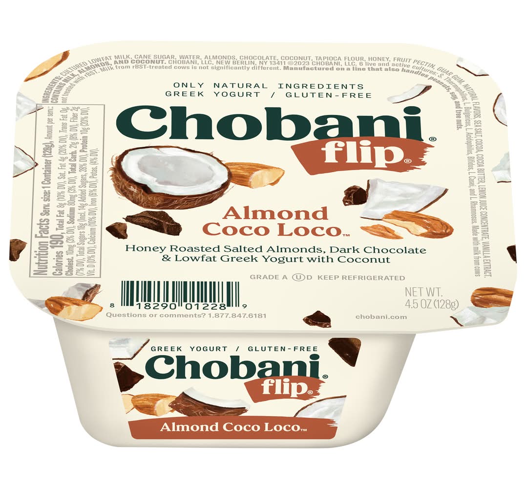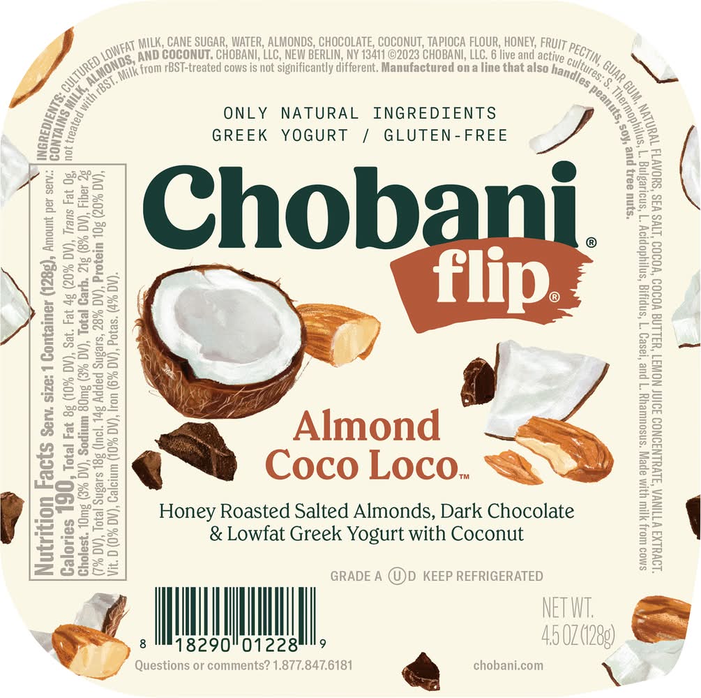Honey roasted salted almonds, dark chocolate & Lowfat Greek yogurt with coconut. Gluten free. Only natural ingredients. Made with milk from cows not treated with rBST. Milk from rBST-treated cows is not significantly different. • Flavor: Almond • Chobani, New Berlin, NY 13411,