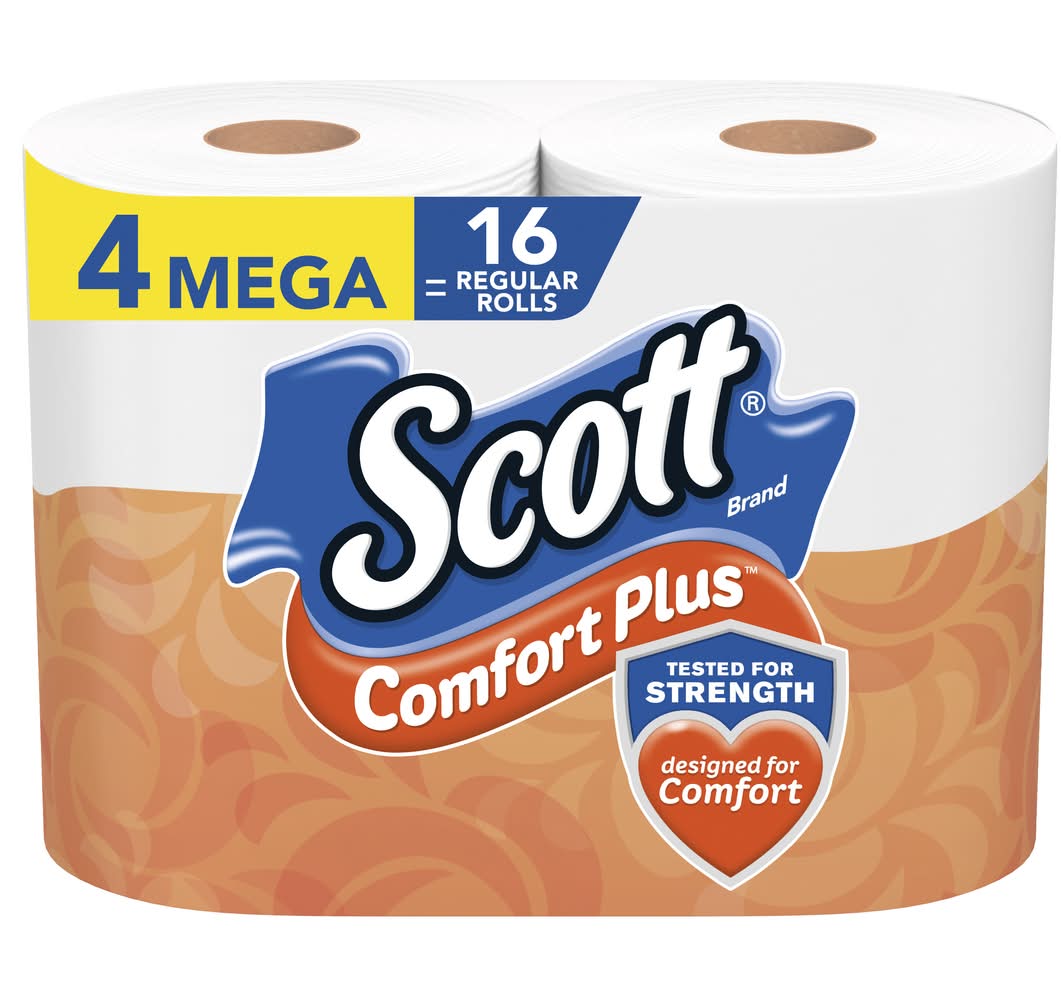Scott ComfortPlus Toilet Paper, 4 Mega Rolls, 425 Sheets per Roll, Septic-Safe, 1-Ply Toilet Tissue Packaging: Reusable