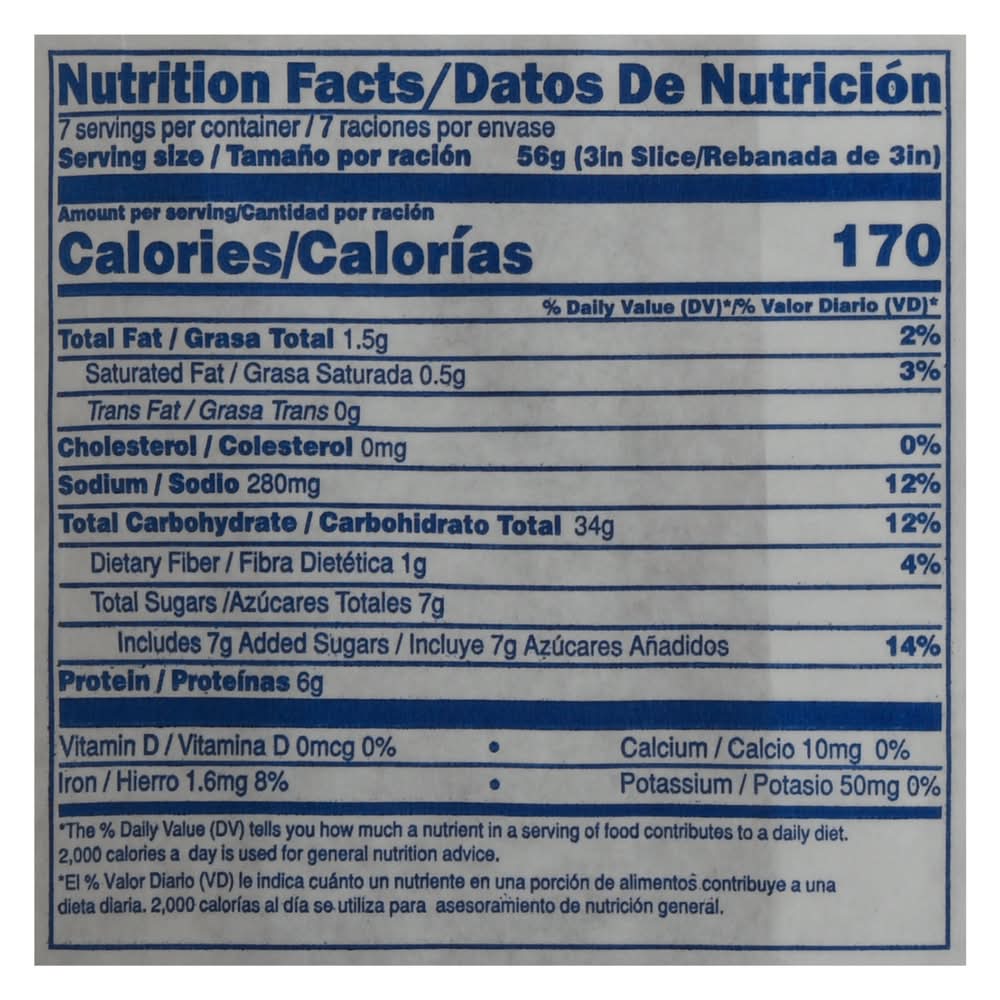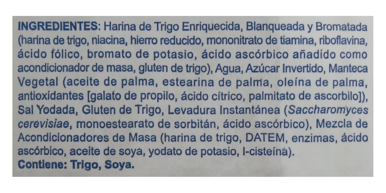 Ingredients: Bromated Enriched Bleached Wheat Flour (Wheat Flour, Niacin, Reduced Iron, Thiamine Mononitrate, Riboflavin, Folic Acid, Potassium Bromate, Ascorbic Acid Added as a Dough Conditioner, Wheat Gluten), Water, Invert Sugar, Vegetable Shortening (Palm Oil, Palm Stearin, Palm Olein, Antioxidants [Propyl Gallate, Citric Acid and Ascorbyl Palmitate]), Iodized Salt, Wheat Gluten, Instant Yeast (Saccharomyces Cerevisiae, Sorbitan Monostearate, Ascorbic Acid), Dough Conditioner Blend (Wheat Flour, DATEM, Enzymes, Ascorbic Acid, Soybean Oil, Potassium Iodate, L-Cysteine) Contains: Wheat, Soybeans, Gluten, Milk, Tree Nuts, Hazelnuts/Filberts, Sesame