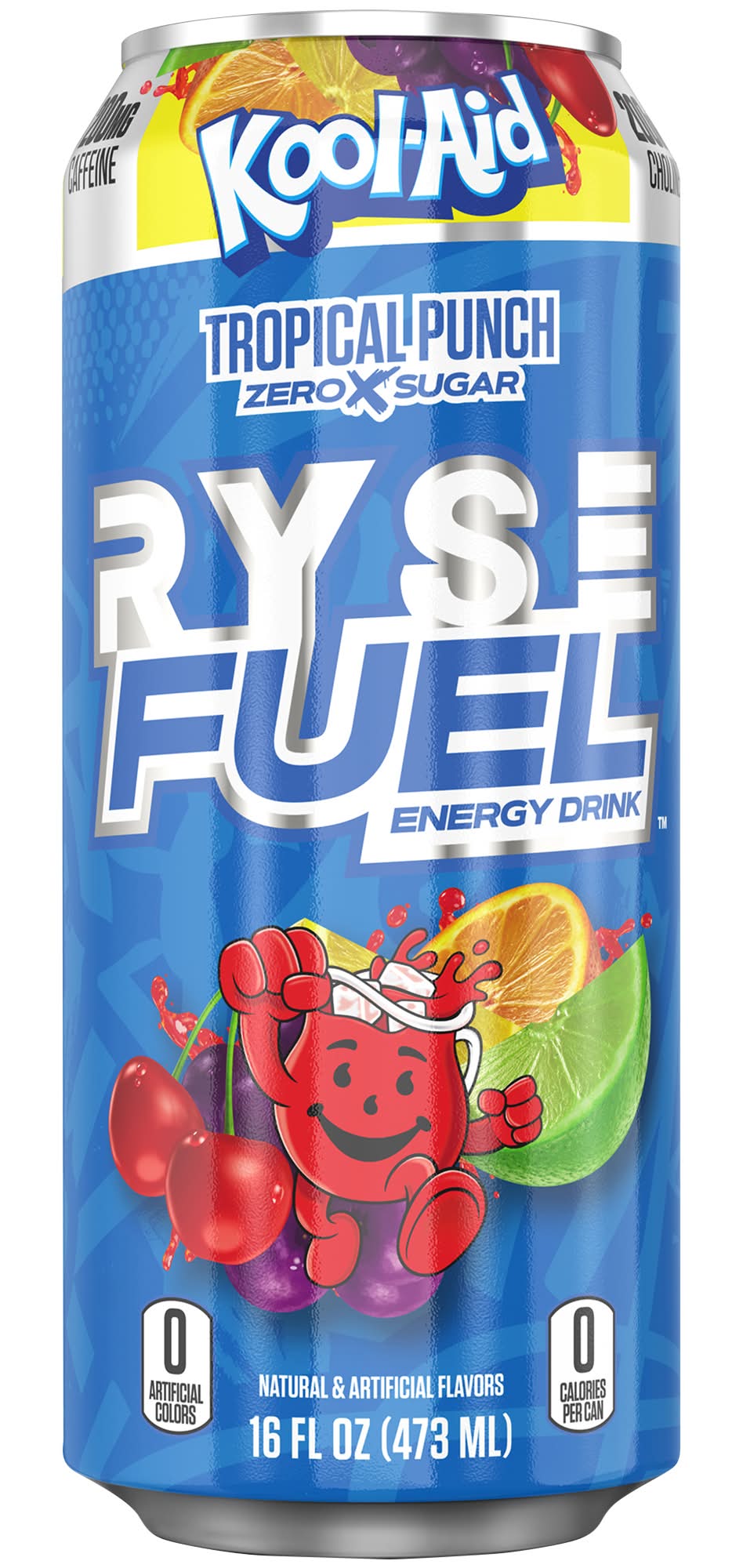 Ryse Fuel Zero Sugar Energy Drink, in a 16 fl oz serving, offers a blend of 500mg Taurine, 500mg Choline Bitartrate, and 200mg of natural caffeine, accompanied by a full spectrum of vitamins. It is formulated to provide sharp focus and sustained energy. The drink is low in calories, free from gluten and soy, contains no sugars, and is made without artificial colors. Enjoy the refreshing taste of Kool-Aid Tropical Punch in every sip. • Brand: Ryse fuel • Flavor: Kool aid • gluten-free,