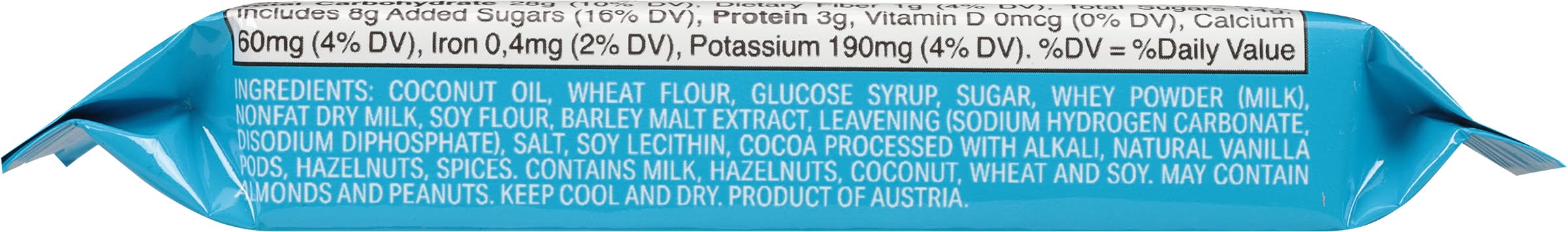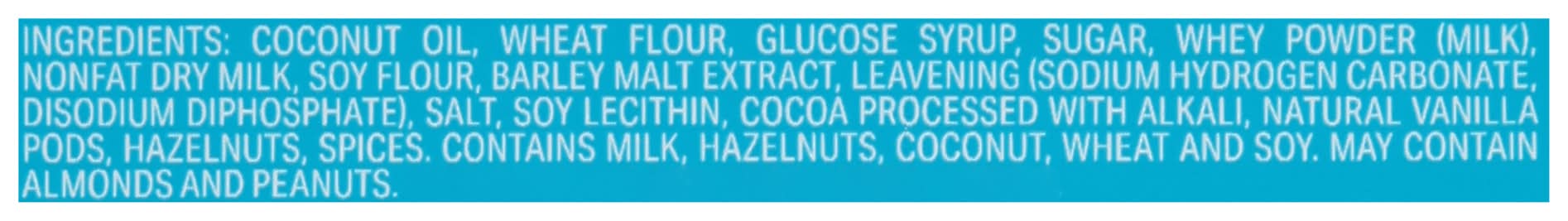 Ingredients: Coconut Oil, Wheat Flour, Glucose Syrup, Sugar, Whey Powder (Milk), Nonfat Dry Milk, Soy Flour, Barley Malt Extract, Leavening (Sodium Hydrogen Carbonate, Disodium Diphosphate), Salt, Soy Lecithin, Cocoa Processed with Alkali, Natural Vanilla Pods, Hazelnuts, Spices Contains: Milk, Tree Nuts, Hazelnuts/Filberts, Tree Nuts, Coconuts, Wheat, Soybeans, Barley, Tree Nuts, Almonds, Peanuts