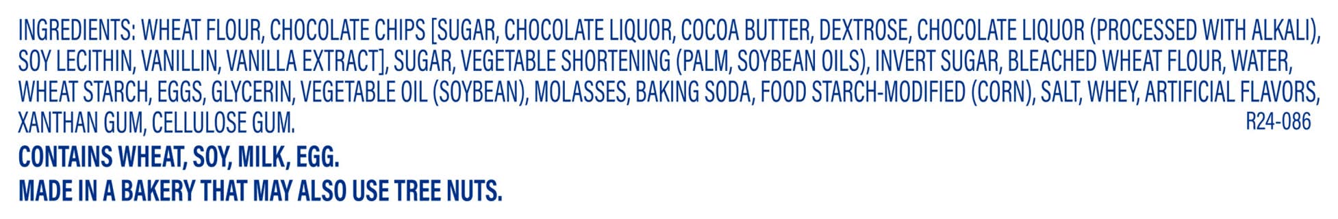 Ingredients: Wheat Flour, Chocolate Chips [Sugar, Chocolate Liquor, Cocoa Butter, Dextrose, Chocolate Liquor (Processed with Alkali), Soy Lecithin, Vanillin, Vanilla Extract], Sugar, Vegetable Shortening (Palm, Soybean Oils), Invert Sugar, Bleached Wheat Flour, Water, Wheat Starch, Eggs, Glycerin, Vegetable Oil (Soybean), Molasses, Baking Soda, Food Starch-Modified (Corn), Salt, Whey, Artificial Flavors, Xanthan Gum, Cellulose Gum. Contains: Wheat, Soybeans, Milk, Eggs, Corn, Tree Nuts