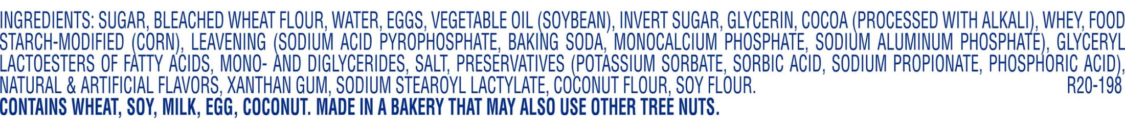 Ingredients: SUGAR, BLEACHED WHEAT FLOUR, WATER, EGGS, VEGETABLE OIL (SOYBEAN), INVERT SUGAR, GLYCERIN, COCOA (PROCESSED WITH ALKALI), WHEY, FOOD STARCH-MODIFIED (CORN), LEAVENING [SODIUM ACID PYROPHOSPHATE, BAKING SODA, MONOCALCIUM PHOSPHATE, SODIUM ALUMINUM PHOSPHATE], GLYCERYL LACTOESTERS OF FATTY ACIDS, MONO- AND DIGLYCERIDES, SALT, PRESERVATIVES [POTASSIUM SORBATE, SORBIC ACID, SODIUM PROPIONATE, PHOSPHORIC ACID], NATURAL ARTIFICIAL FLAVORS, XANTHAN GUM, SODIUM STEAROYL LACTYLATE, COCONUT FLOUR, SOY FLOUR. Contains: CONTAINS COCONUT, EGG, MILK, SOY, WHEAT.