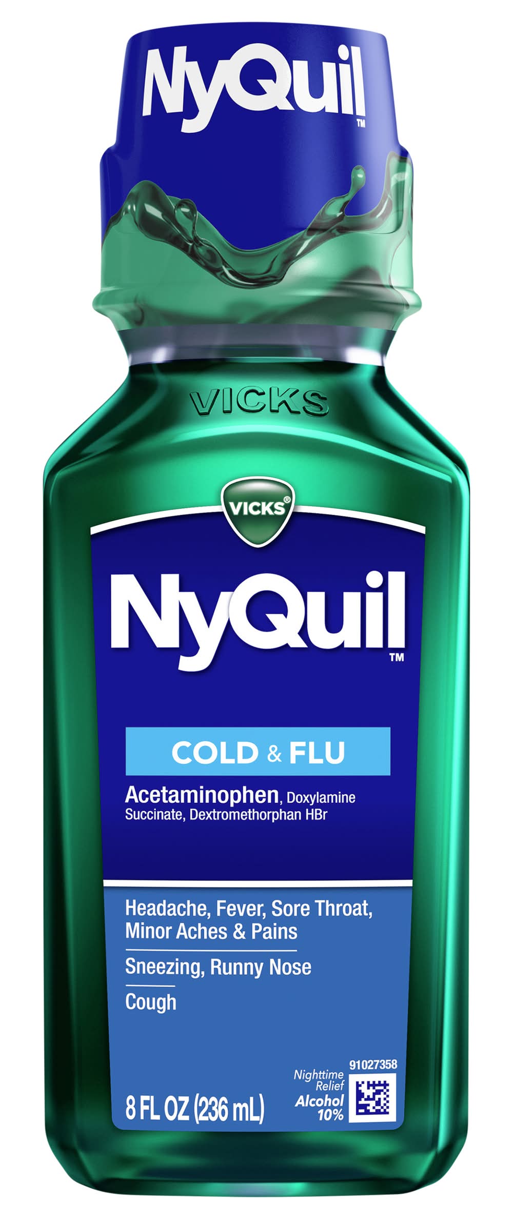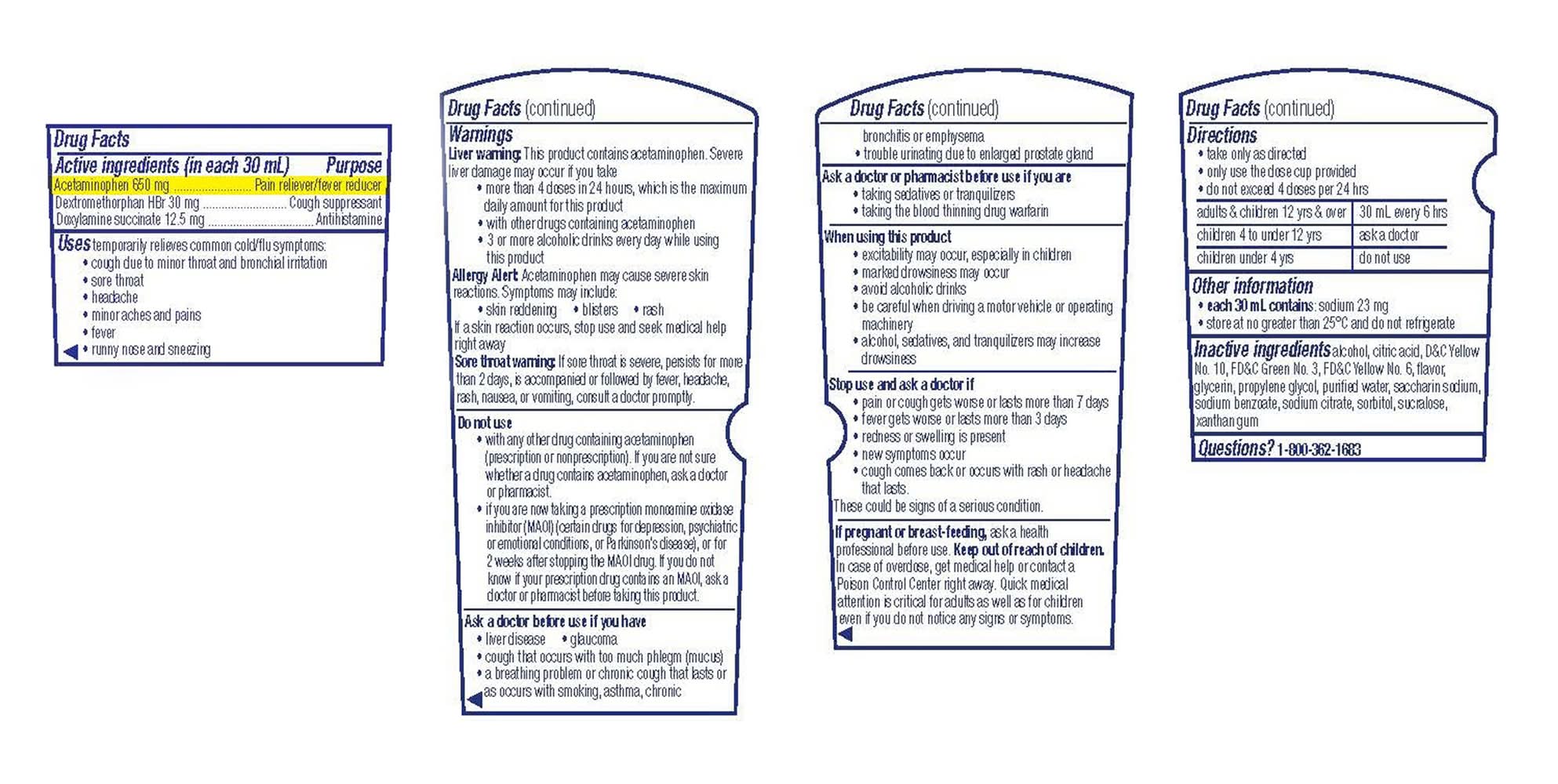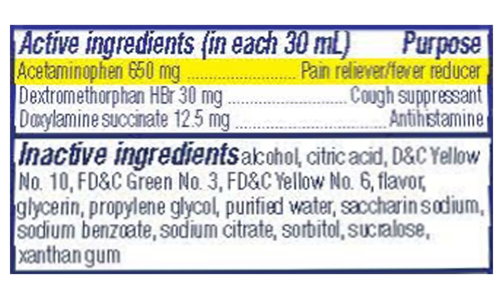 Ingredients: In Each 30 ml Active Ingredients: Acetaminophen (650 mg), Pain Reliever/Fever Reducer.; Dextromethorphan HBR (30 mg), Cough Suppressant.; Doxylamine Succinate (12.5 mg), Antihistamine. Additives: Alcohol, Citric Acid, D&C Yellow 10, FD&C Green 3,, FD&C Yellow 6, Flavor, Glycerin, Propylene Glycol, Purified Water, Saccharin Sodium,, Sodium Benzoate, Sodium Citrate, Sorbitol, Sucralose, Xanthan Gum