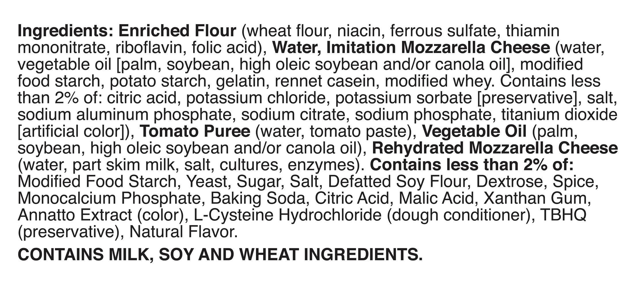 Ingredients: Enriched Flour (Wheat Flour, Niacin, Ferrous Sulfate, Thiamin Mononitrate, Riboflavin, Folic Acid), Water, Imitation Mozzarella Cheese (Water, Vegetable Oil [Palm, Soybean, High Oleic Soybean and/or Canola Oil], Modified Food Starch, Potato Starch, Gelatin, Rennet Casein, Modified Whey, Contains Less than 2% of: Citric Acid, Potassium Chloride, Potassium Sorbate [Preservative], Salt, Sodium Aluminum Phosphate, Sodium Citrate, Sodium Phosphate, Titanium Dioxide [Artificial Color]), Tomato Puree (Water, Tomato Paste), Vegetable Oil (Palm, Soybean, High Oleic Soybean and/or Canola Oil), Rehydrated Mozzarella Cheese (Water, Part Skim Milk, Salt, Cultures, Enzymes), Contains Less than 2% of: Modified Food Starch, Yeast, Sugar, Salt, Defatted Soy Flour, Dextrose, Spice, Monocalcium Phosphate, Baking Soda, Citric Acid, Malic Acid, Xanthan Gum, Annatto Extract (Color), L-Cysteine Hydrochloride (Dough Conditioner), TBHQ (Preservative), Natural Flavor Contains: Milk, Wheat, Soy