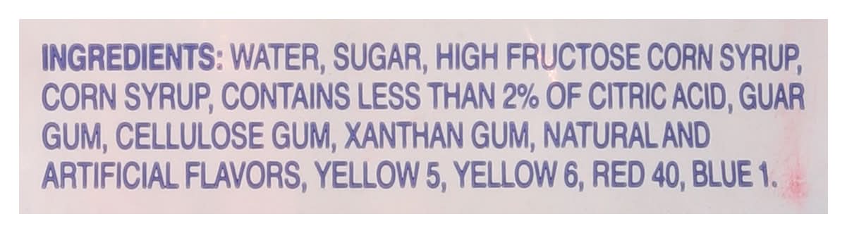 Ingredients: Water, Sugar, High Fructose Corn Syrup, Corn Syrup, Contains Less than 2% of Citric Acid, Guar Gum, Cellulose Gum, Xanthan Gum, Natural and Artificial Flavors, Yellow 5, Yellow 6, Red 40, Blue 1